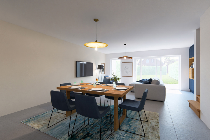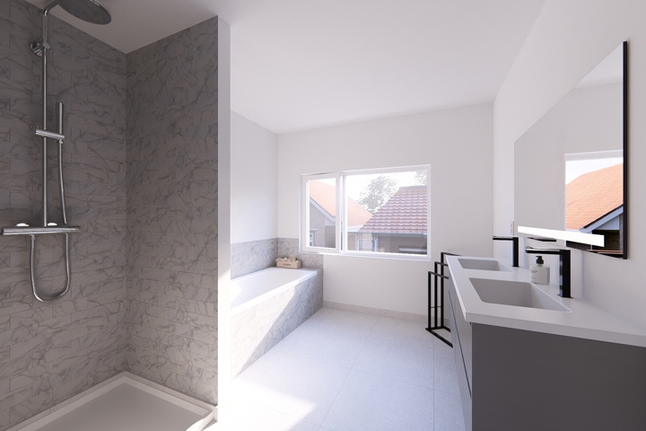 : châssis PVC double-vitrage, portes intérieures prêtes à peindre, tablettes de fenêtre en marbre blanc ou en pierre bleue, escalier en hêtre