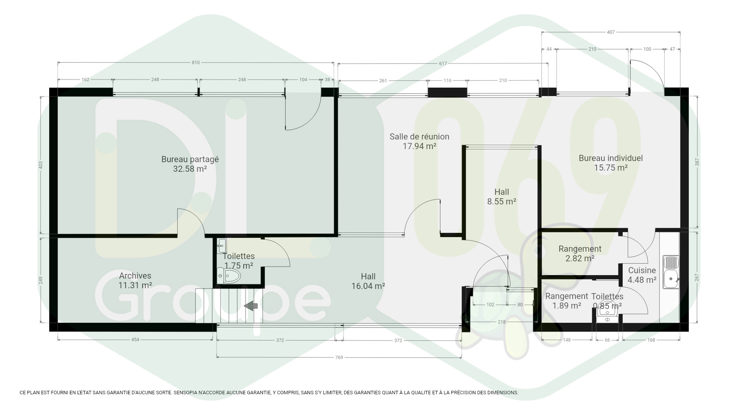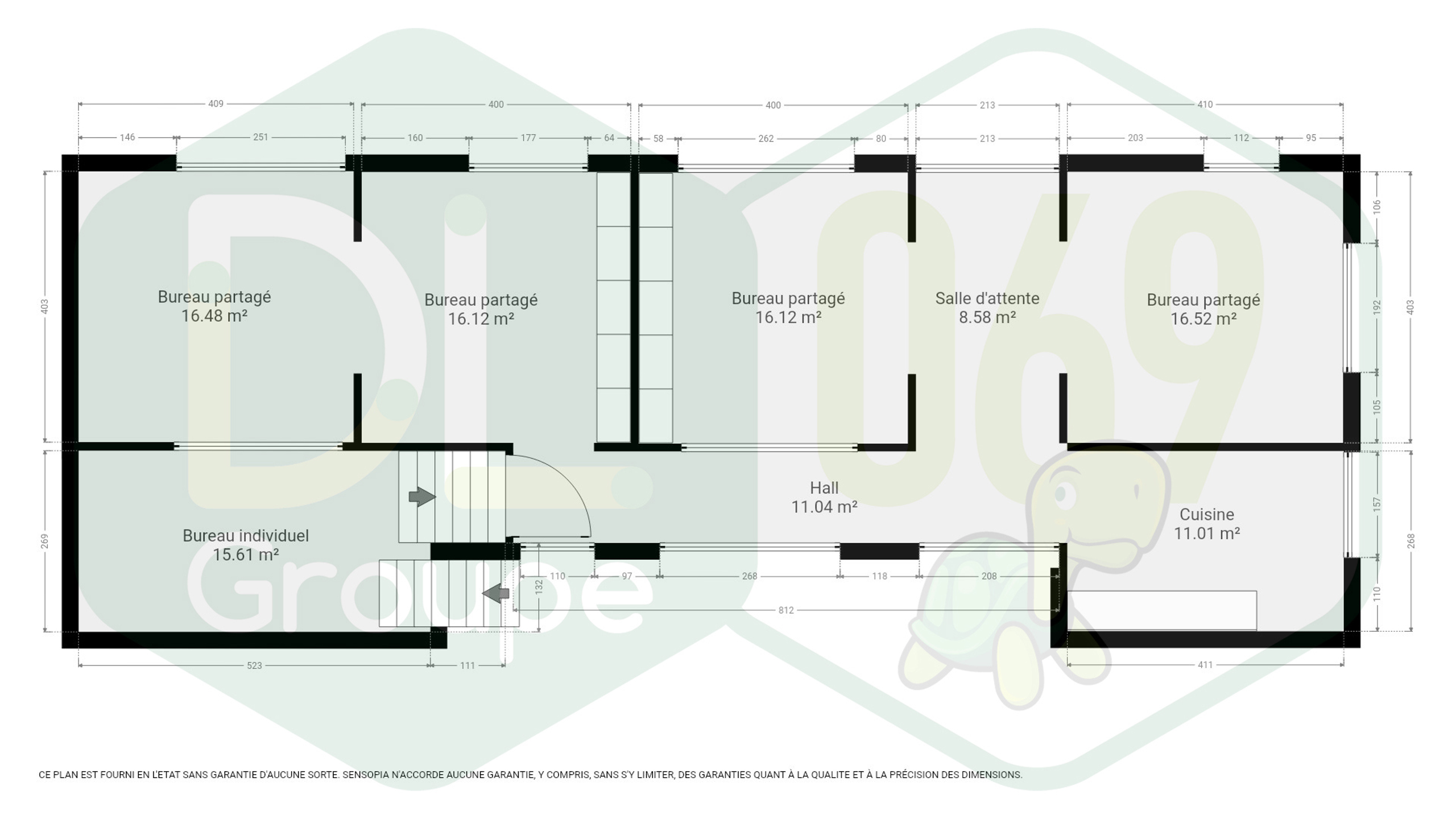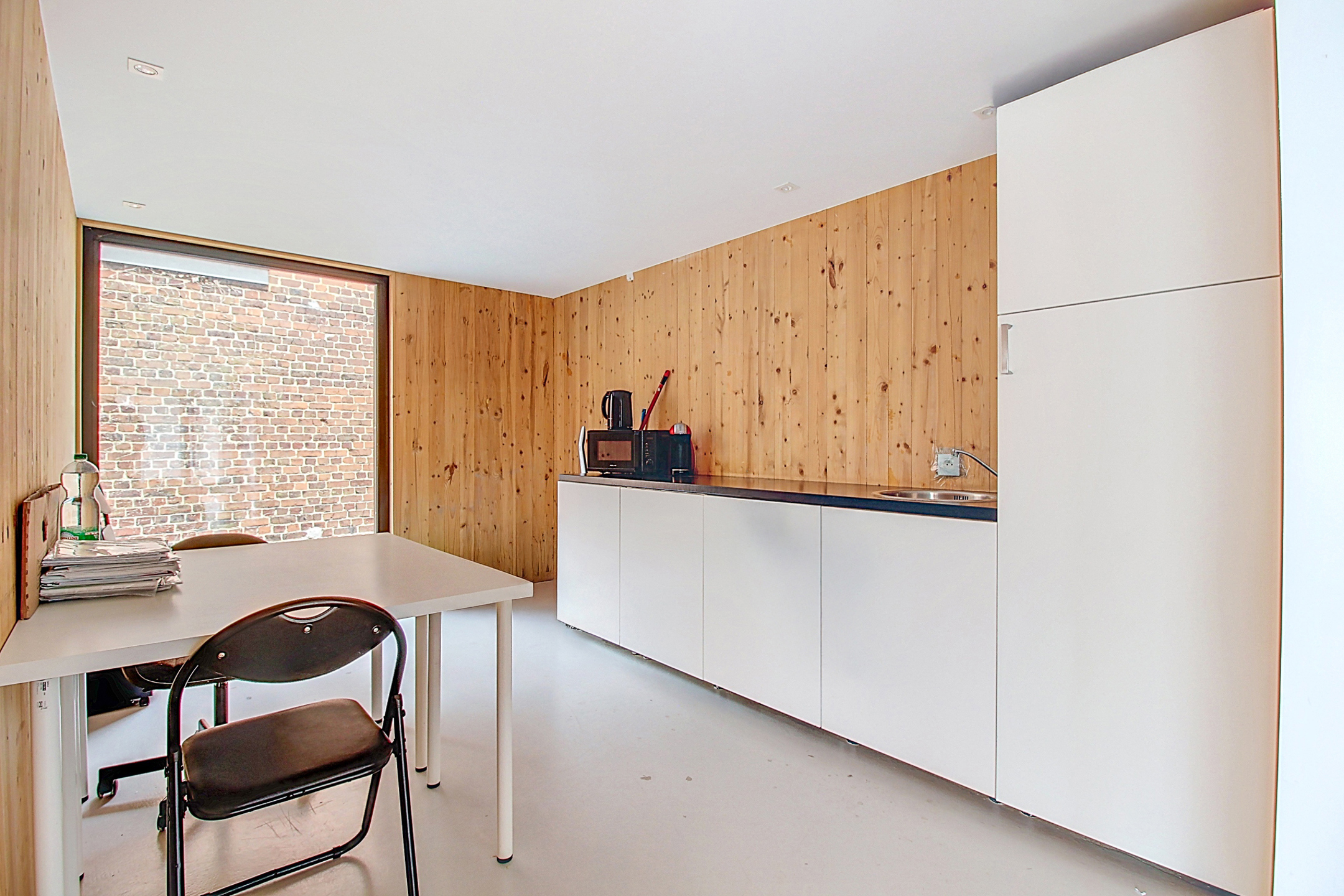 À l’étage, un demi-niveau accueille un espace bureau/accueil, puis le niveau principal comprend deux bureaux communicants, une cuisine et deux autres bureaux indépendants.