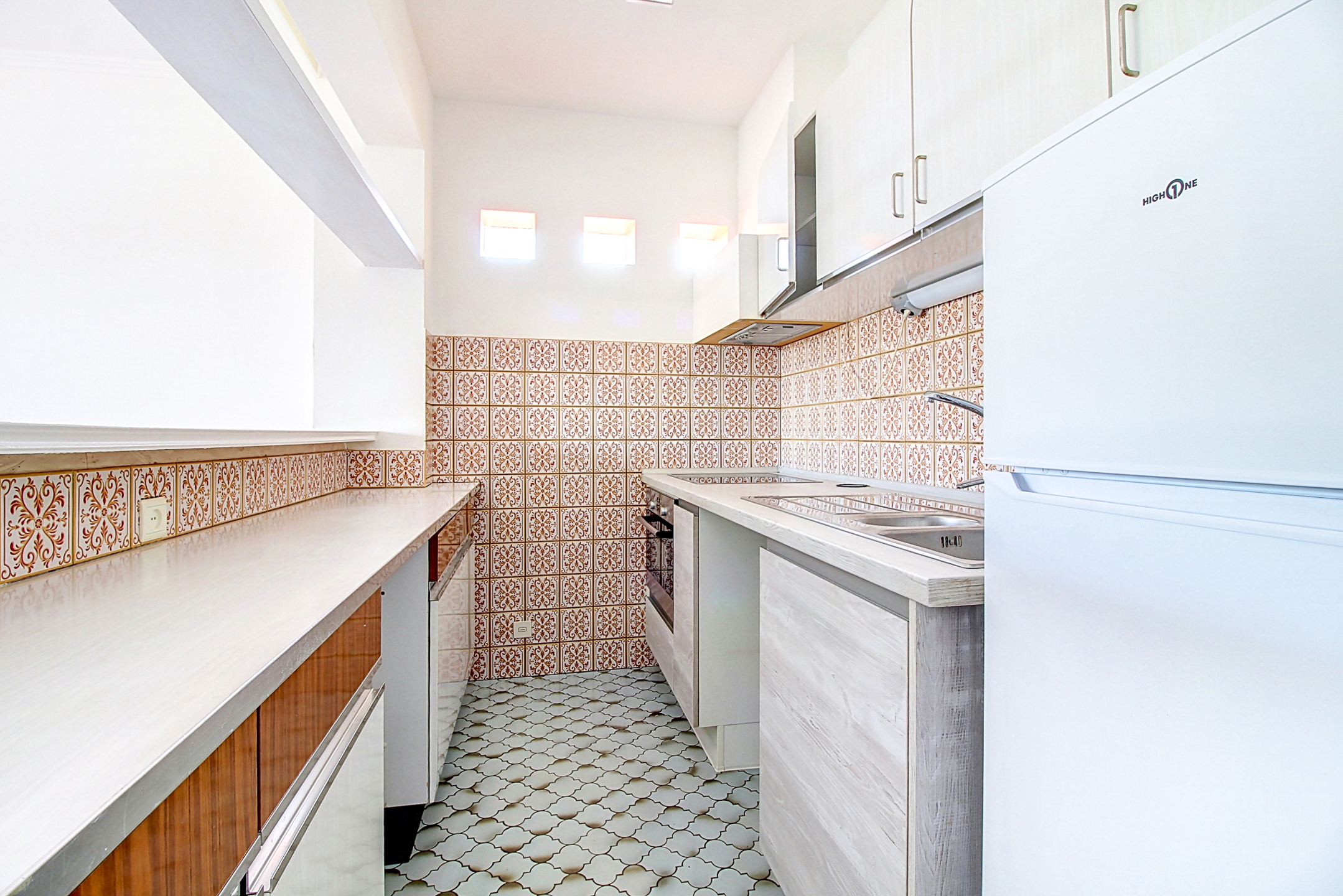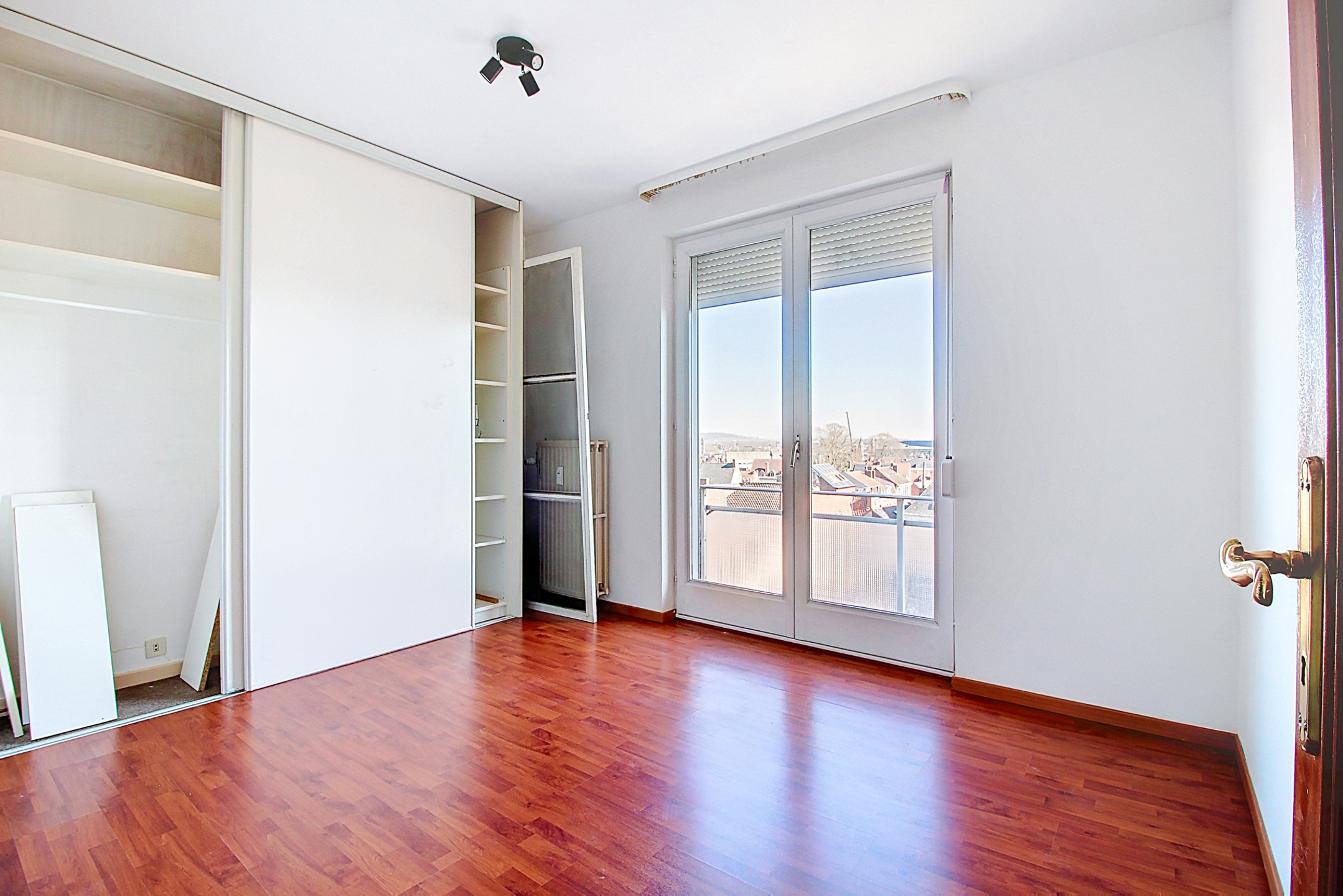 Hall d’entrée menant à un séjour lumineux comprenant un salon et une salle à manger avec accès au balcon en façade offrant une vue panoramique sur Tournai. La cuisine semi-équipée dispose d’une taque vitrocéramique, d’un four, d’une hotte et d’un évier.