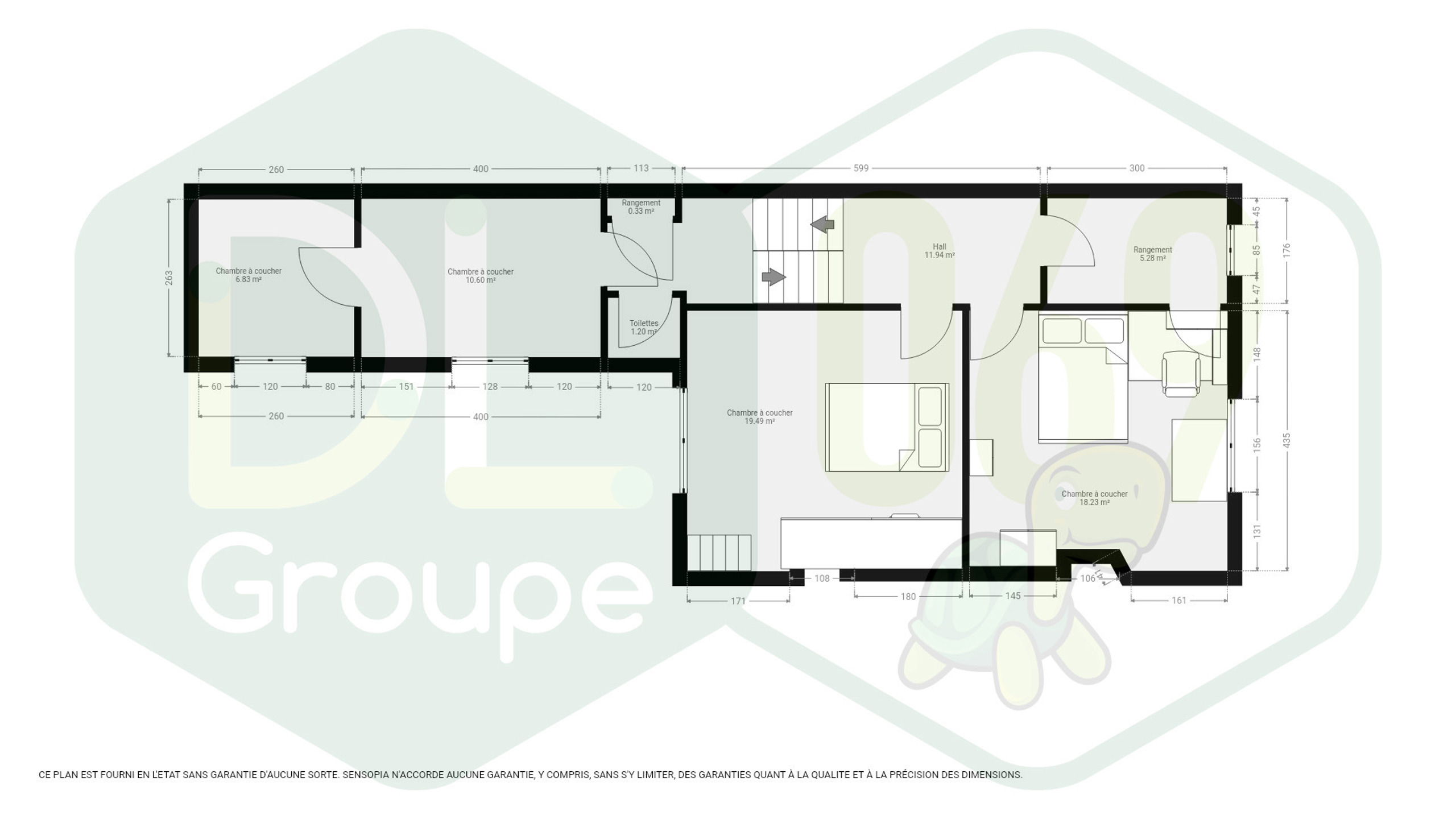À l’étage, l’espace nuit se compose de deux grandes chambres de 18 et 19 m², ainsi qu’une troisième chambre de 10 m² bénéficiant d’un espace de rangement de 7 m², offrant la possibilité d’aménager une salle de bain supplémentaire.