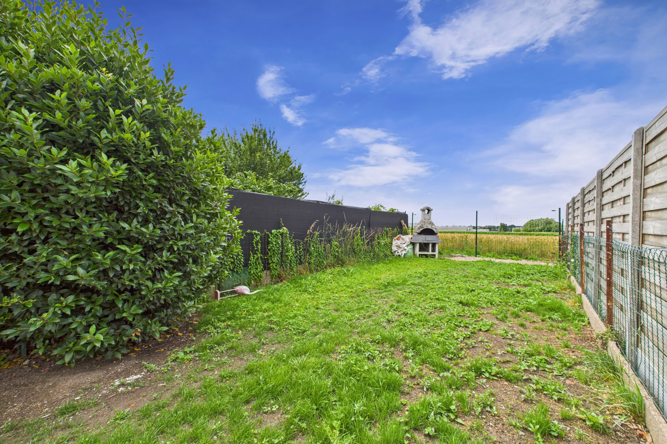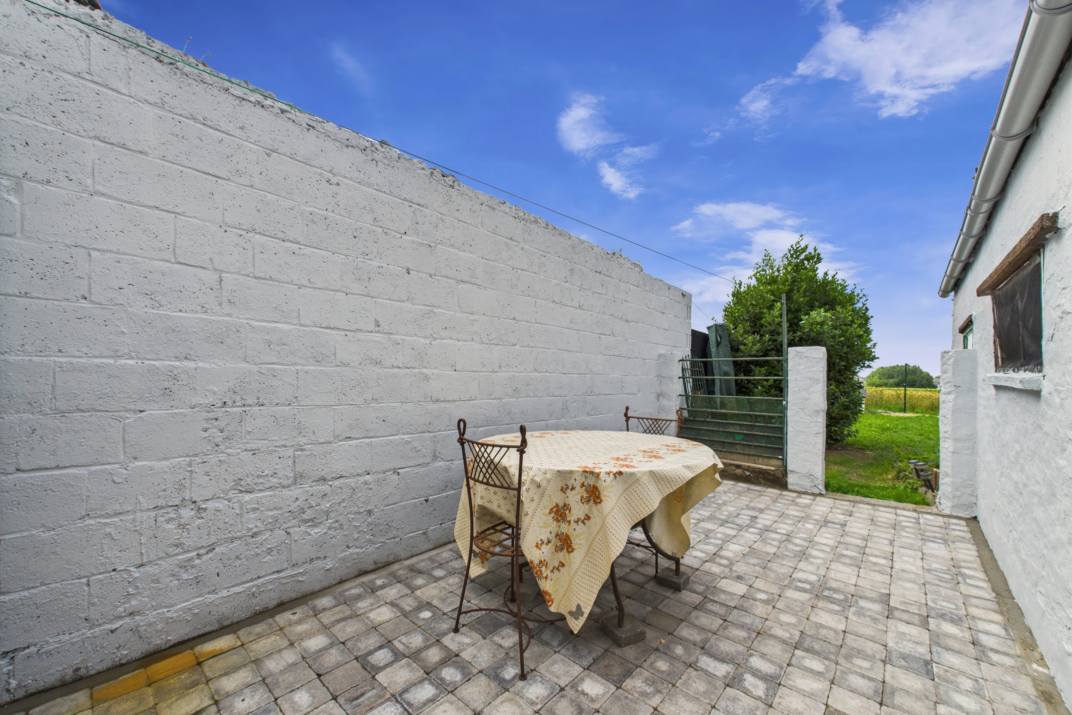 À l’extérieur, une terrasse en pavés et un jardin clôturé offrent une vue dégagée sur les champs.