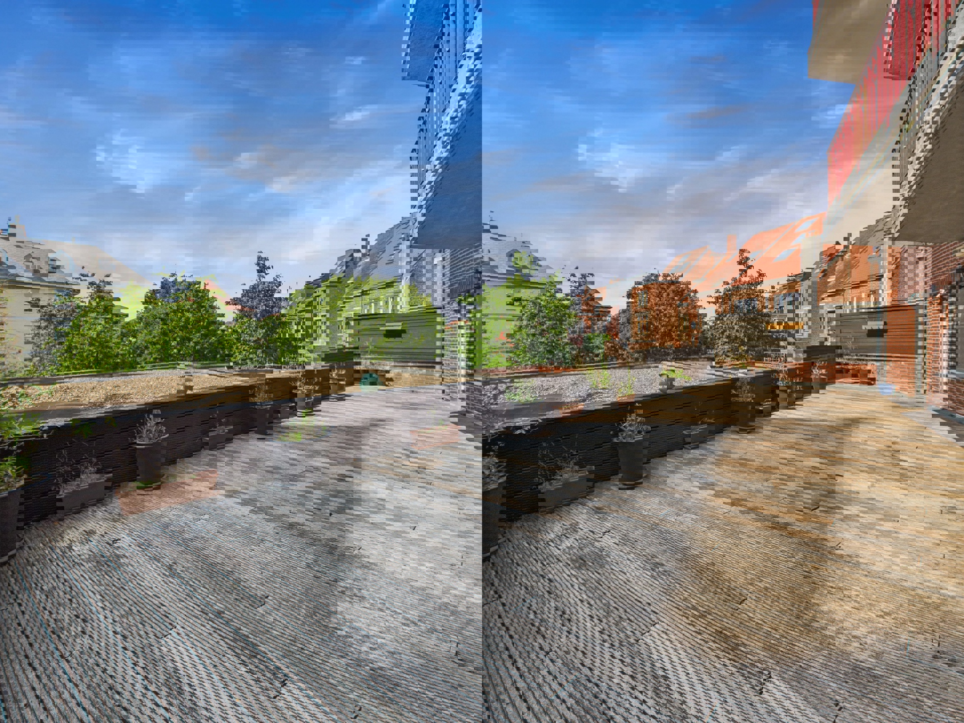 Hall d’entrée avec placards de rangement desservant un très grand séjour lumineux avec vue panoramique sur la Grand-Place, une cuisine équipée avec coin chaufferie, une buanderie séparée, un WC, hall de nuit desservant trois chambres avec placards intégrés et accès direct à la terrasse, spacieuse salle de bain avec baignoire, douche, double lavabo et second WC, une belle terrasse de 60 m².