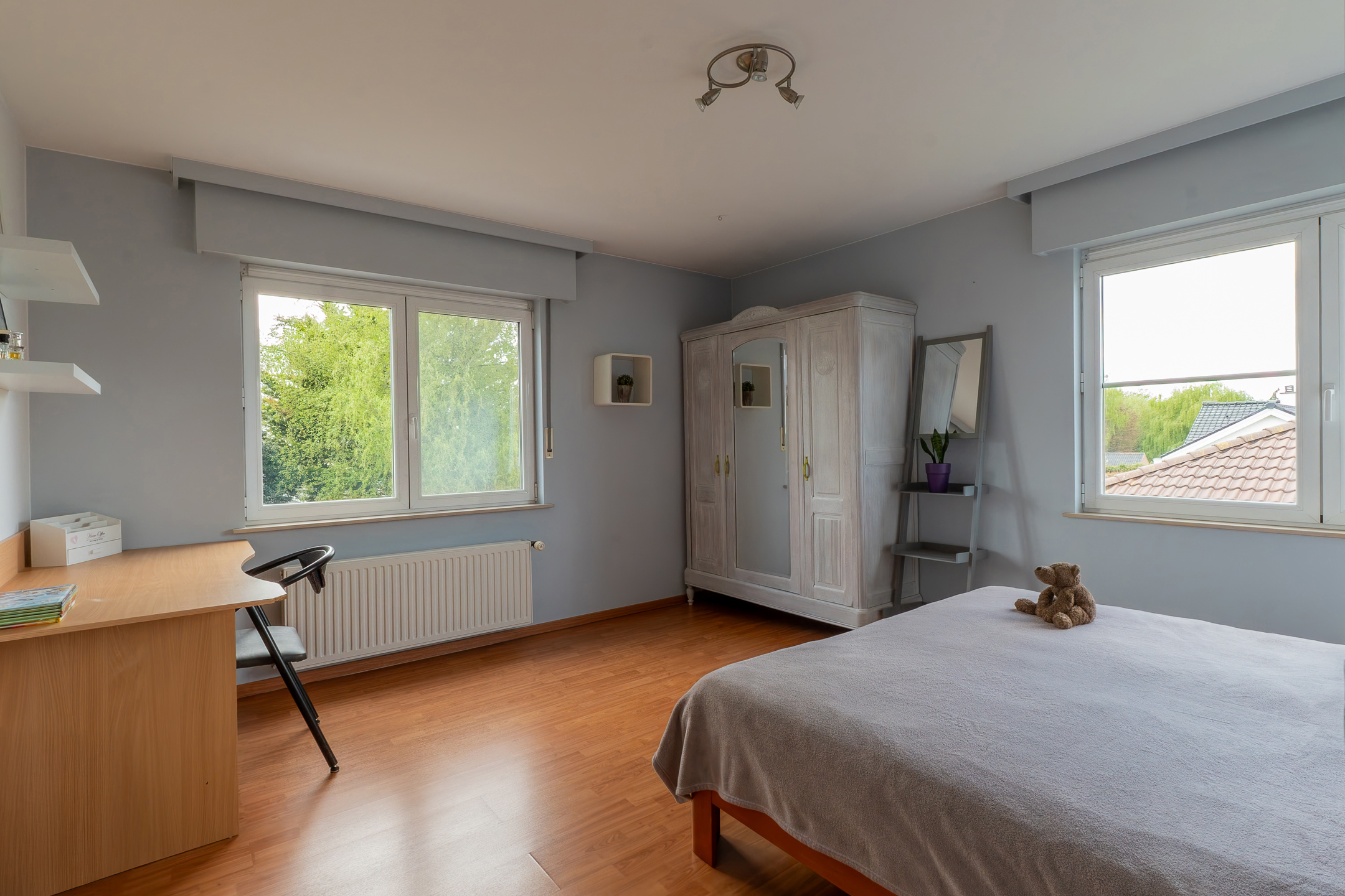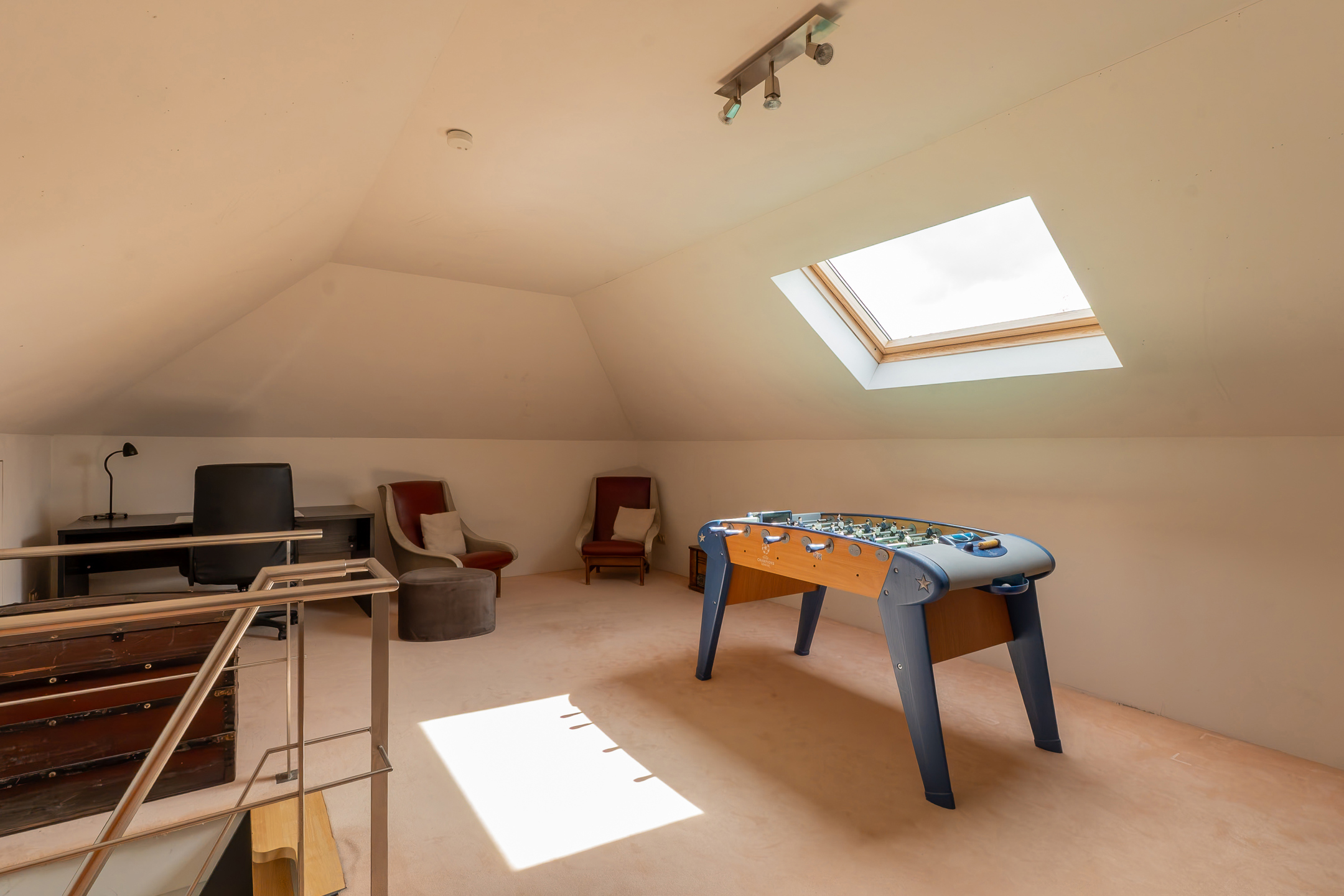 Le deuxième étage propose un espace polyvalent : une cinquième chambre/bureau/salle de jeux, ainsi qu’un grenier de rangement.
