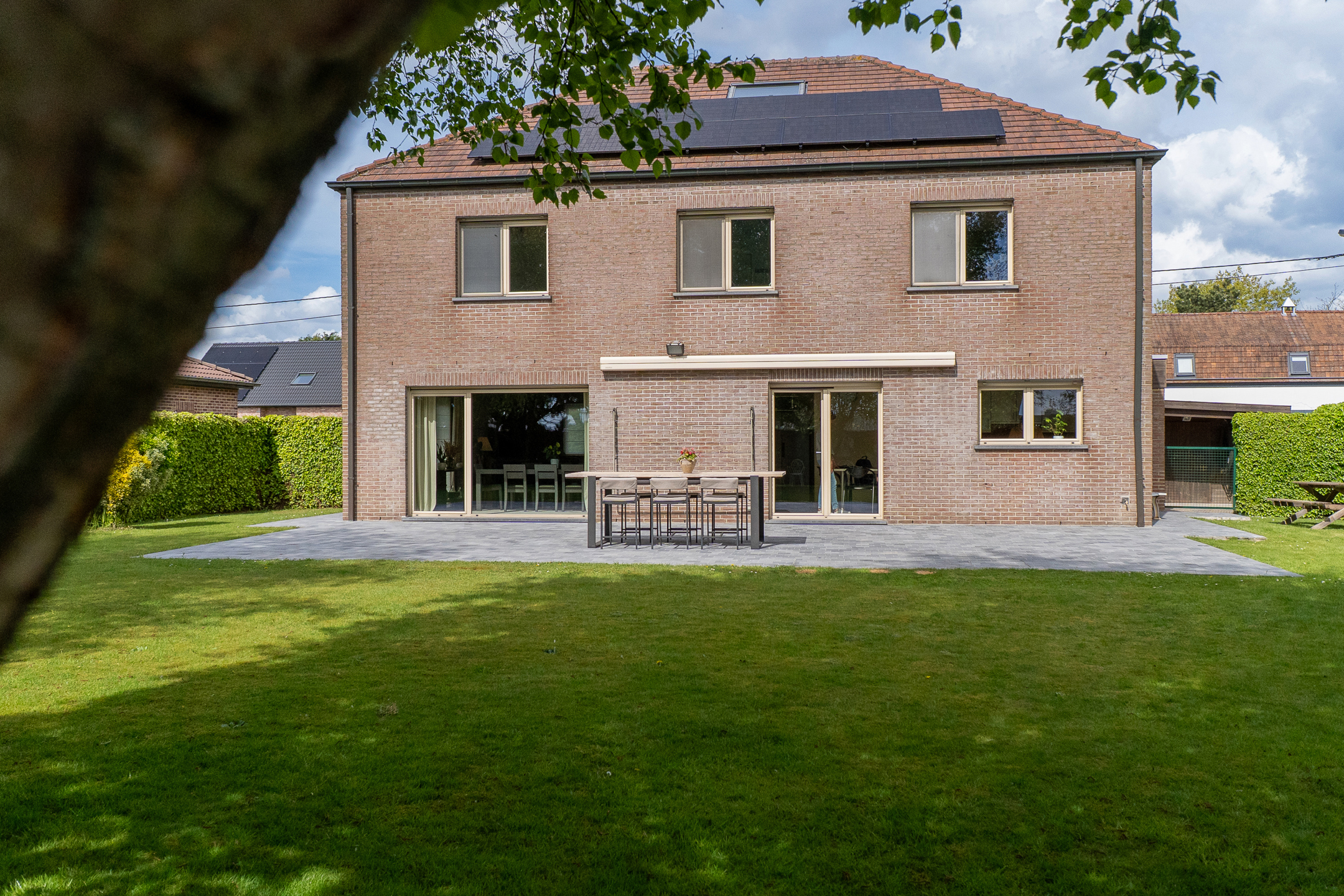 Caractéristiques : Châssis en aluminium double vitrage avec persiennes motorisées et manuelles, chauffage central au gaz, électricité conforme, 9 panneaux photovoltaïques, citerne d’eau de pluie de 10.000l, carport