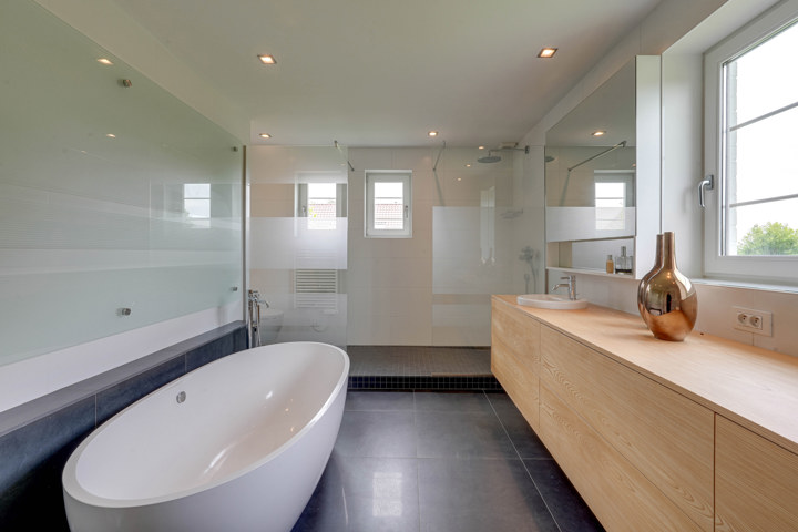 L’étage possède une vaste suite parentale avec salle-de-bains, dressing et pièce supplémentaire (pouvant être aménagée bureau, dressing ou chambre supplémentaire), de deux chambres avec salle-de-bains communicante, ainsi qu`une chambre avec une salle-de-bains.