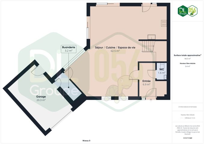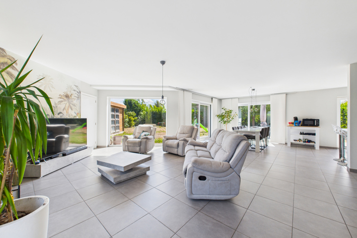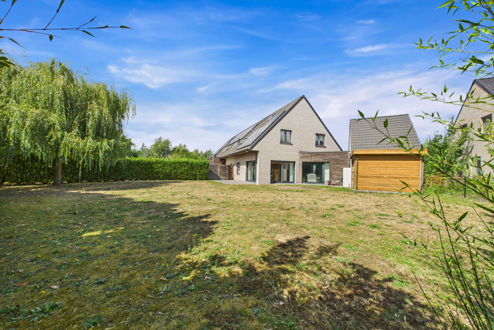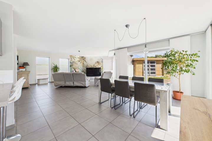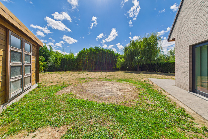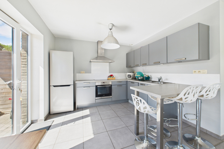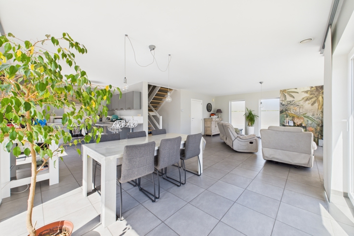 Au REZ: Hall d’entrée avec espace vestiaire, WC avec lave-mains, séjour traversant de ± 44 m² combinant salon et salle à manger, cuisine équipée (taque vitrocéramique, four, évier, hotte, lave-vaisselle), buanderie/réserve, garage une voiture avec porte sectionnelle motorisée donnant également accès directement au jardin, grenier de rangement au-dessus.