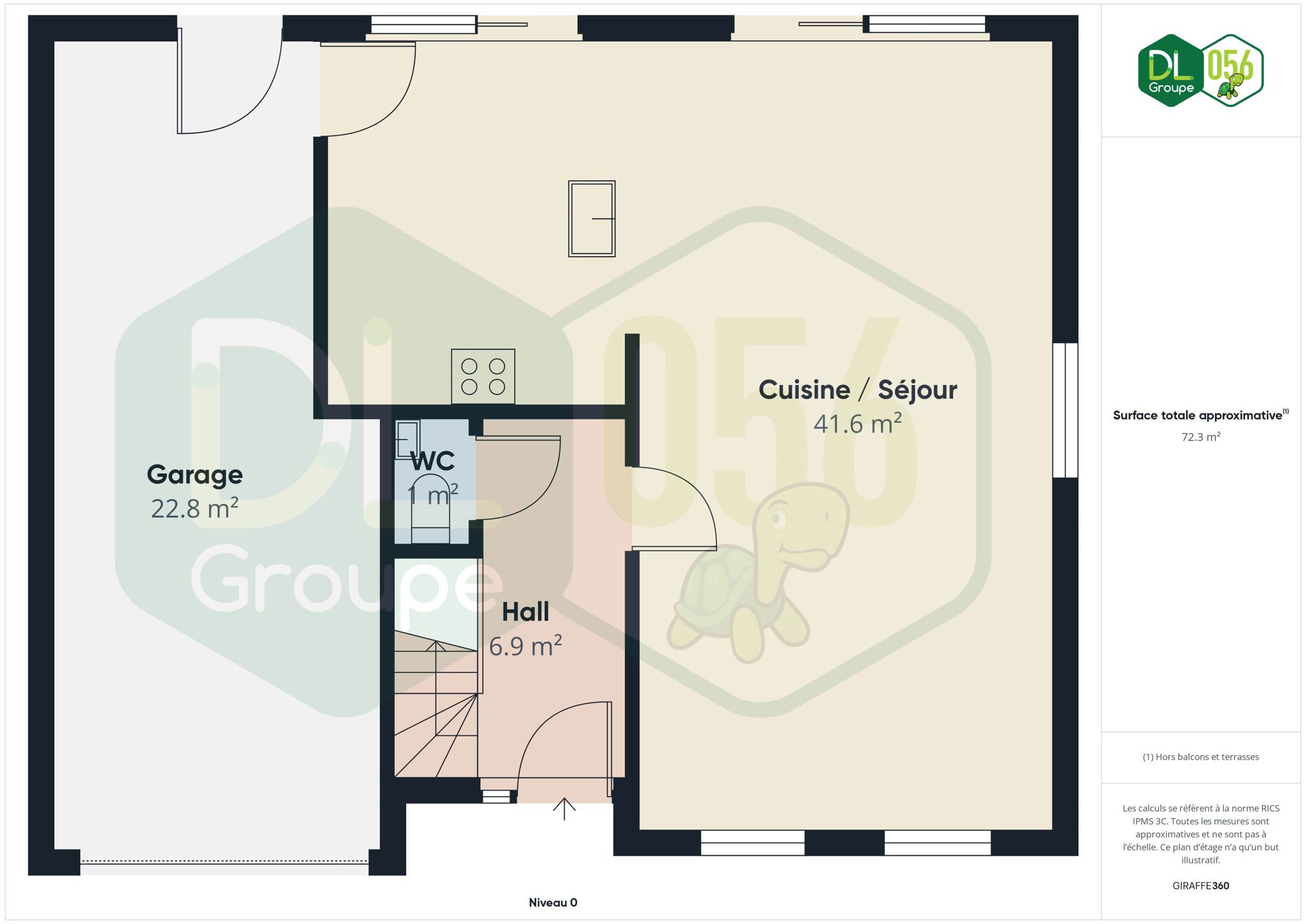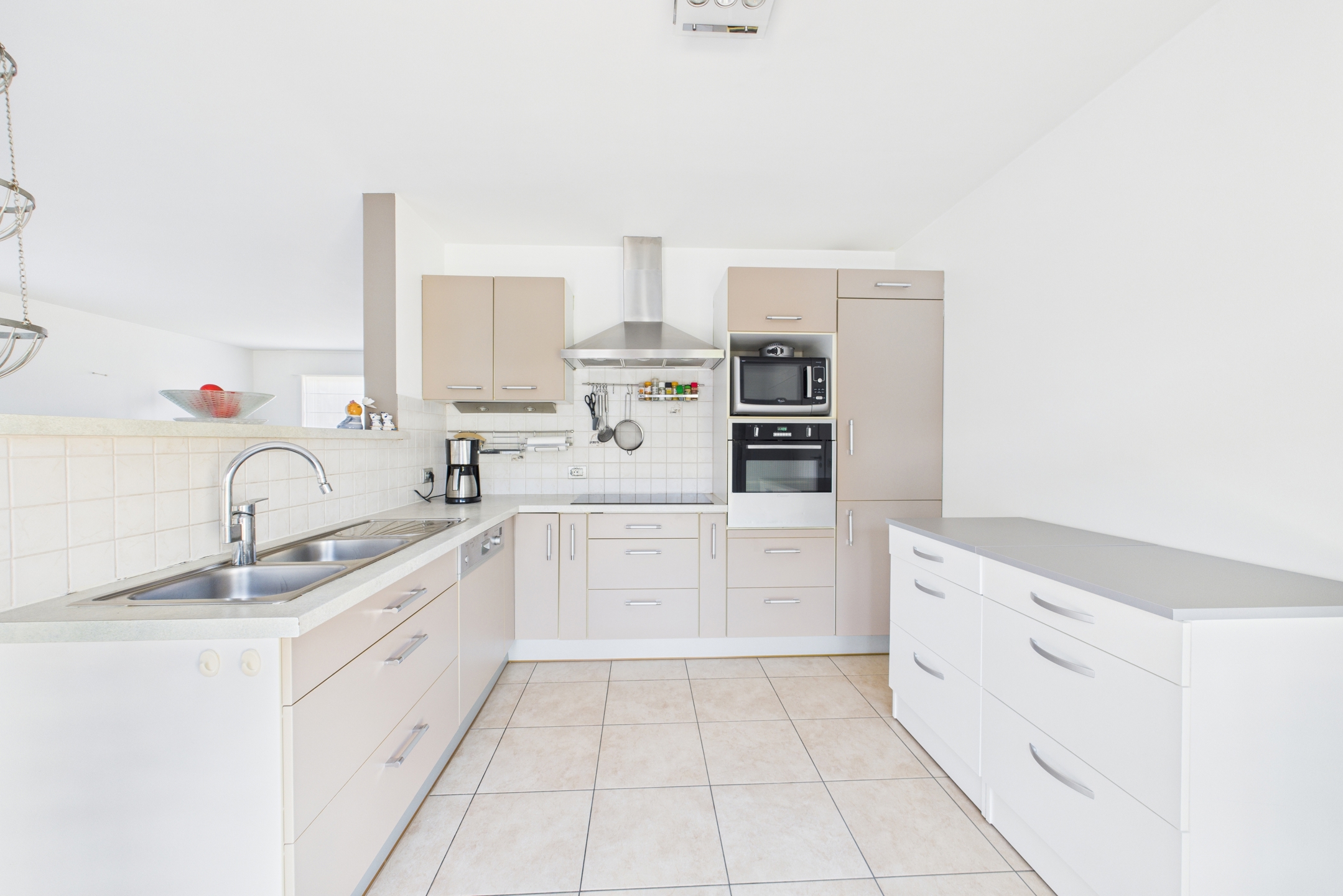 Au rez-de-chaussée : hall d’entrée avec escalier apparent, un WC avec lave-mains, un séjour lumineux (salon et salle à manger), une cuisine équipée attenante (plaque de cuisson, hotte, double évier, lave-vaisselle, four, frigo, nombreux rangements intégrés), un grand garage pour 1 voiture avec espace chaufferie et buanderie.