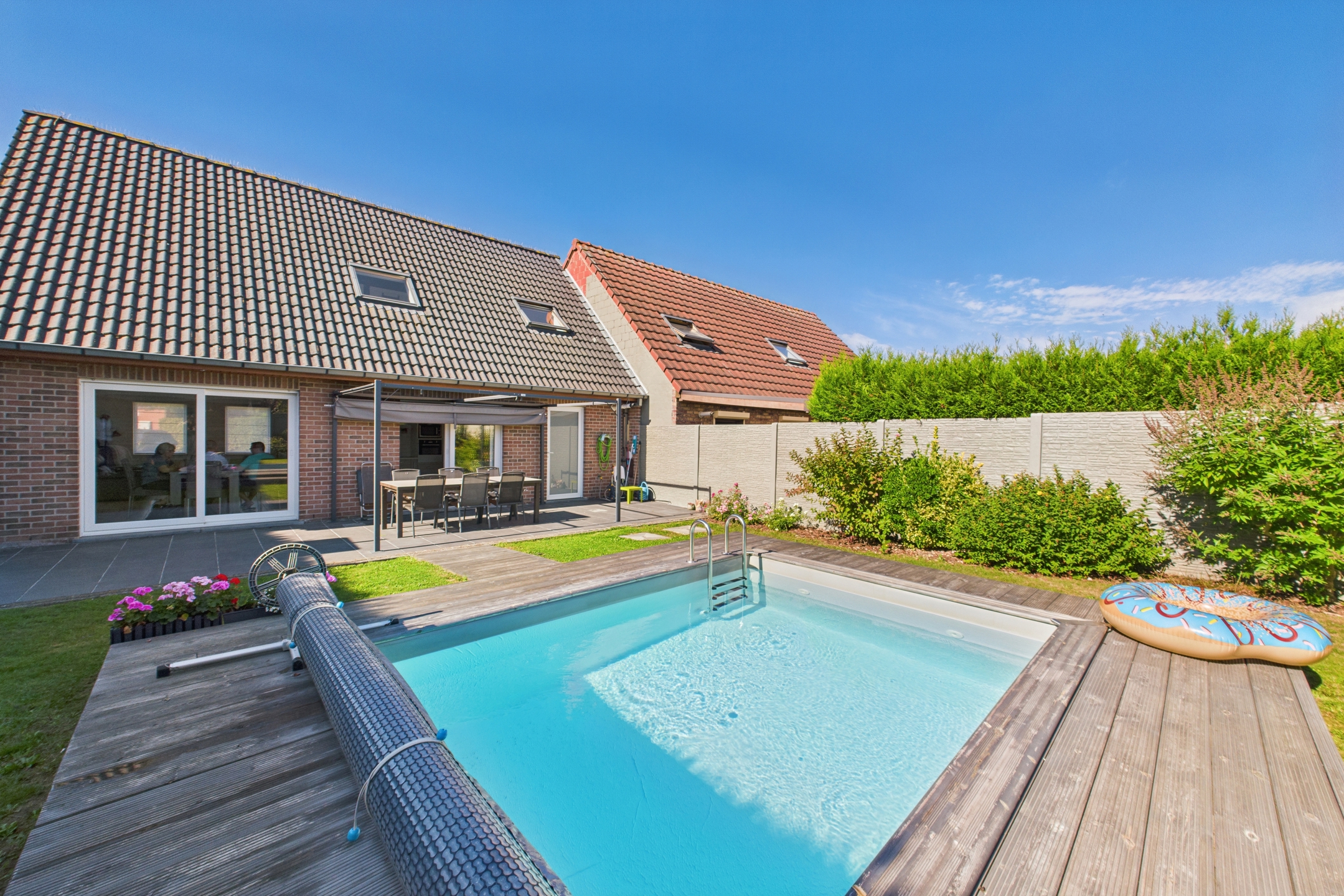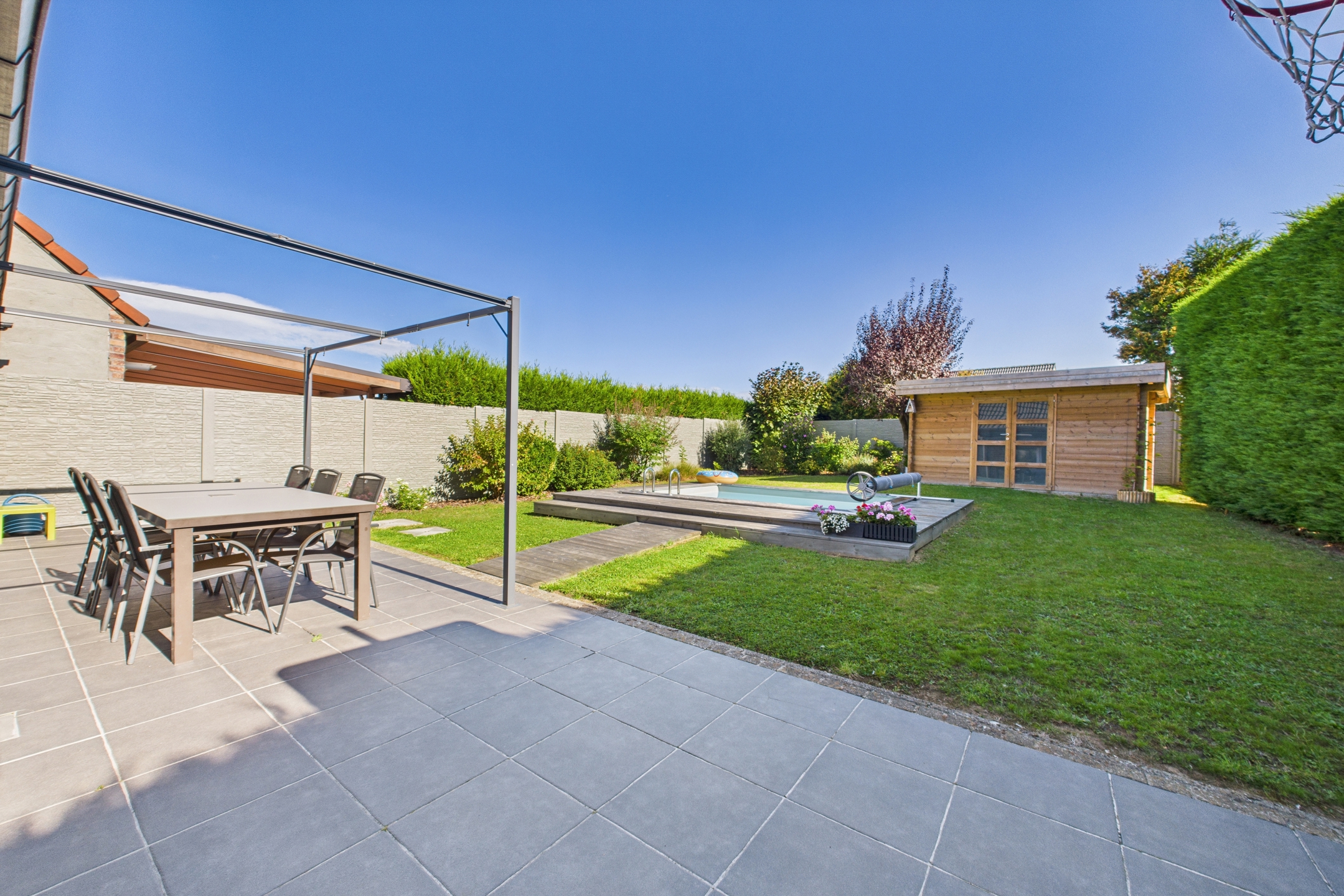 Côté extérieur : terrasse carrelée, jardin clôturé avec piscine chauffée (piscine assez économique en quantité d’eau et en therme de chauffage), abri de jardin en bois, passage latéral et 2 places de parking privatives en façade.