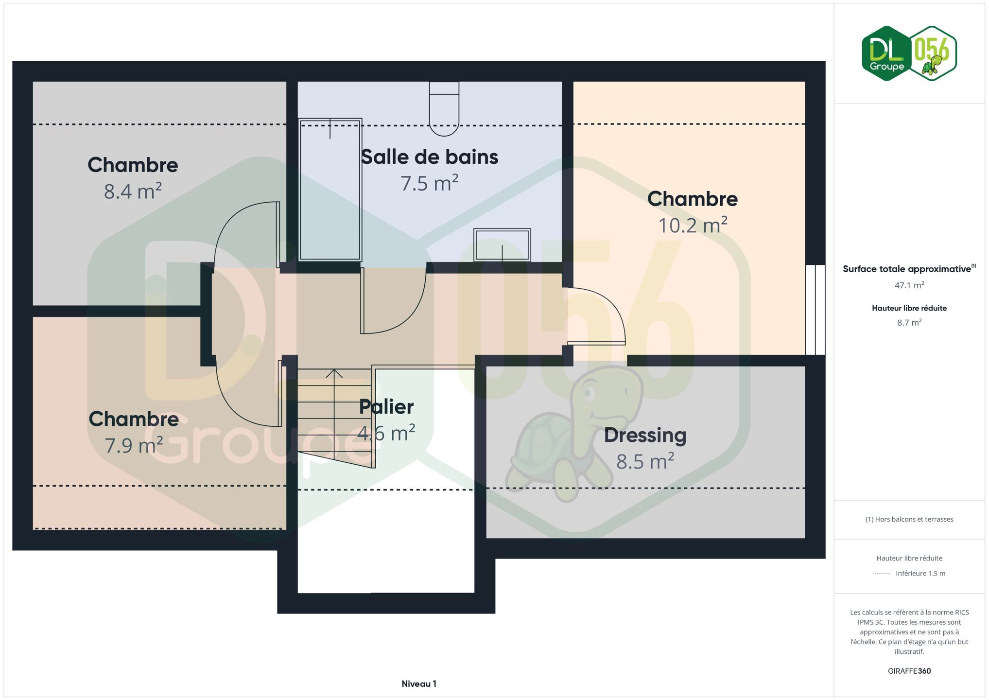 À l’étage : hall de nuit desservant 3 chambres, dont une avec dressing, ainsi qu’une salle de bains composée d’une baignoire/douche, d’un meuble lavabo et d’un WC.