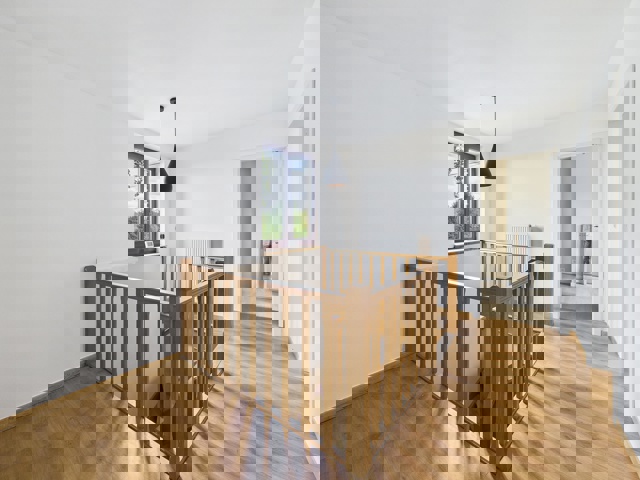 À l’étage, grand hall de nuit de ± 23 m², 3 chambres (± 20 m², 13 m², 11 m²) dont une parentale avec dressing, une salle de bain avec baignoire + douche (± 13 m²), une buanderie avec WC.