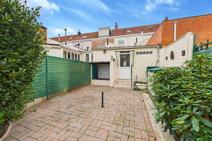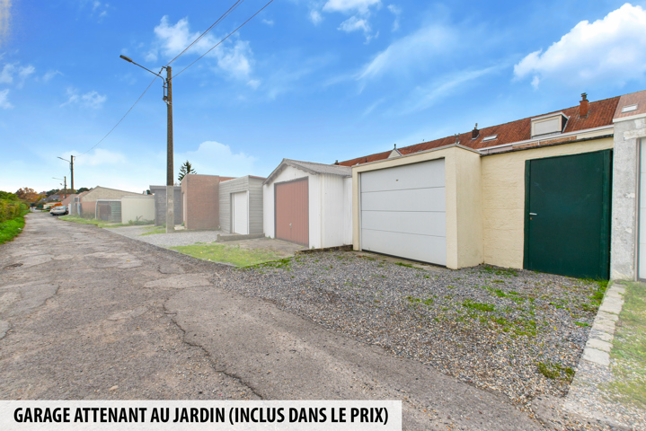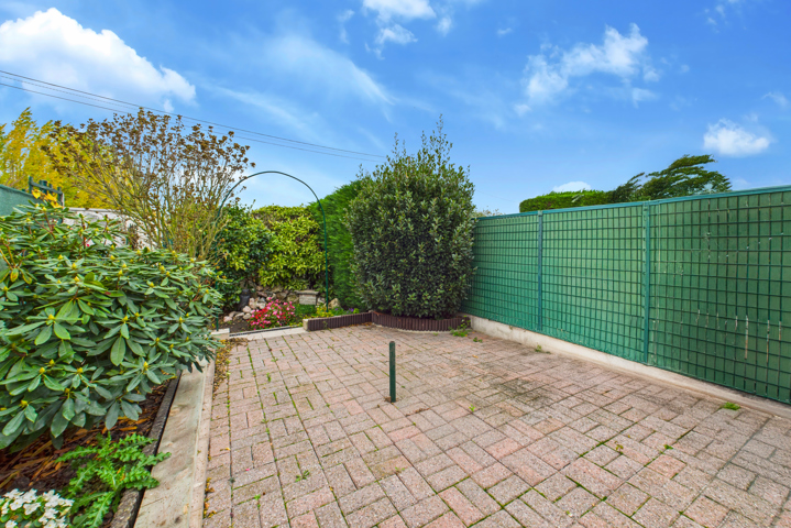 Extérieur : Une terrasse en pavés, un jardin arboré et clôturé, un garage attenant au jardin et un passage à l’arrière, 1 place de parking face au garage.