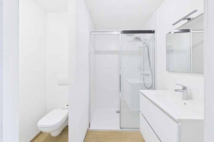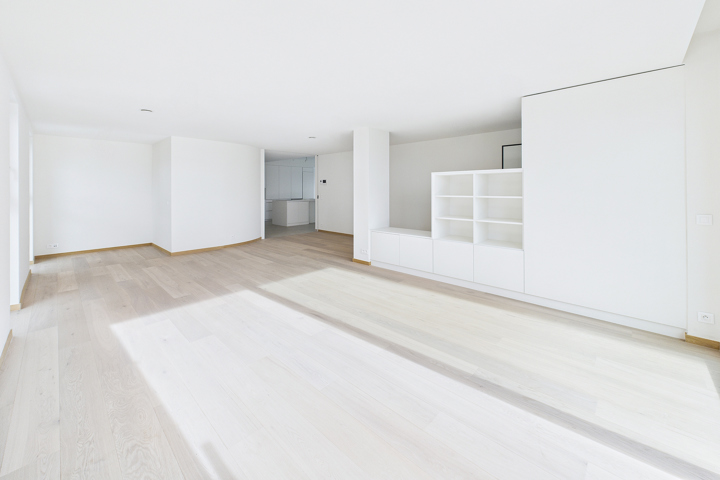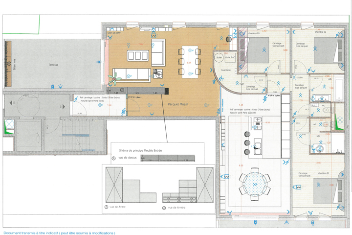 Caractéristiques techniques : Châssis en aluminium double vitrage, stores extérieurs, détecteurs incendie, vidéophonie, porte d’entrée de type « blindée », murs et portes peints, carrelage dans le hall de jour, le hall de nuit, le WC, la salle de bains, la cuisine et le séjour et parquet dans les chambres, chauffage au sol par pompe à chaleur réversible, thermostat d’ambiance, ventilation simple flux de type Renson C+ ou équivalent, terrasse constituée de lattage bois et de dalles sur plots en grès et équipée d’un éclairage Led.