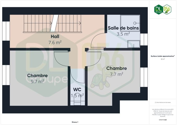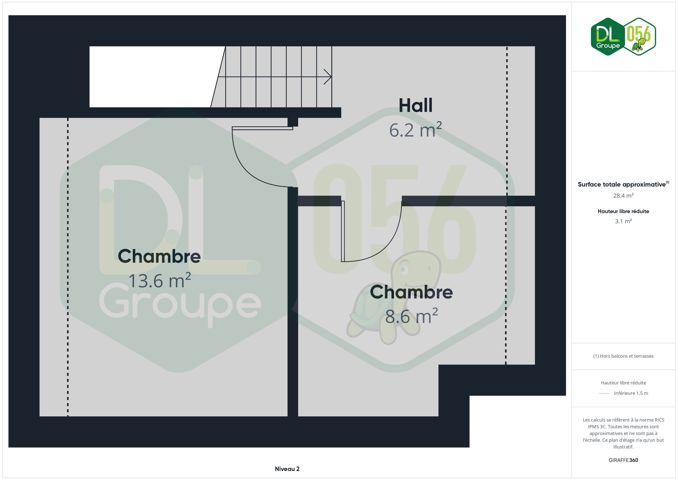 Au 2ème étage : Grenier aménagé en 2 chambres supplémentaires de 14m2 et 9m2, accessible par un escalier fixe situé sur le hall de nuit.