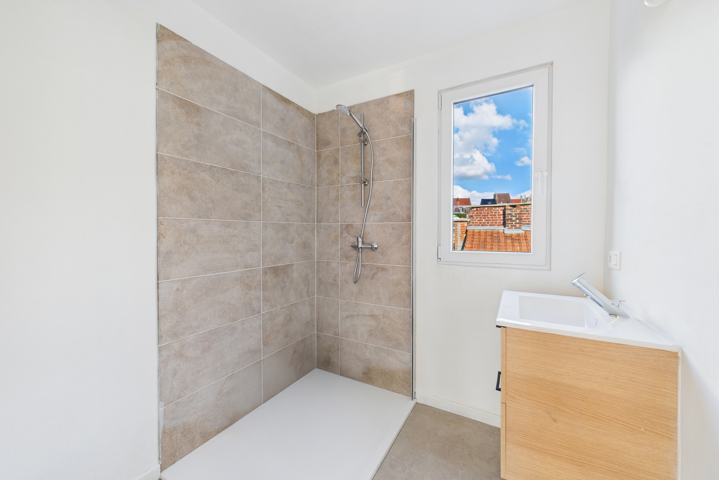 Au 1er étage : un hall de nuit desservant 2 chambres à coucher de 10m2 et 8m2, une salle de bains avec douche à l’italienne et un meuble lavabo, un WC suspendu séparé.