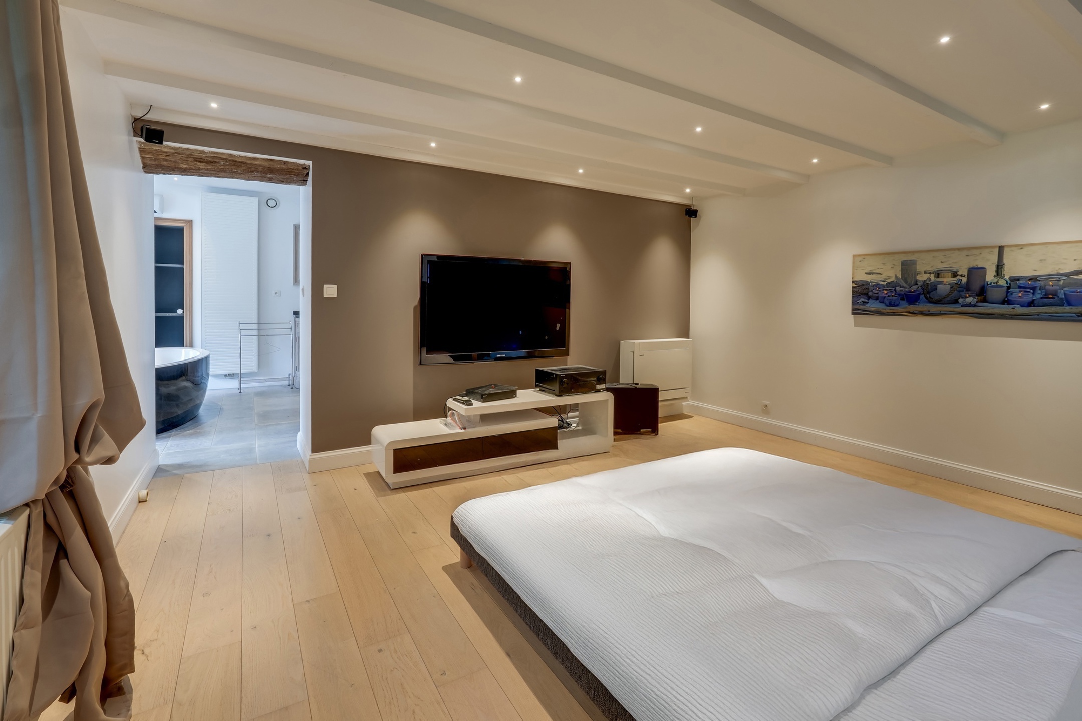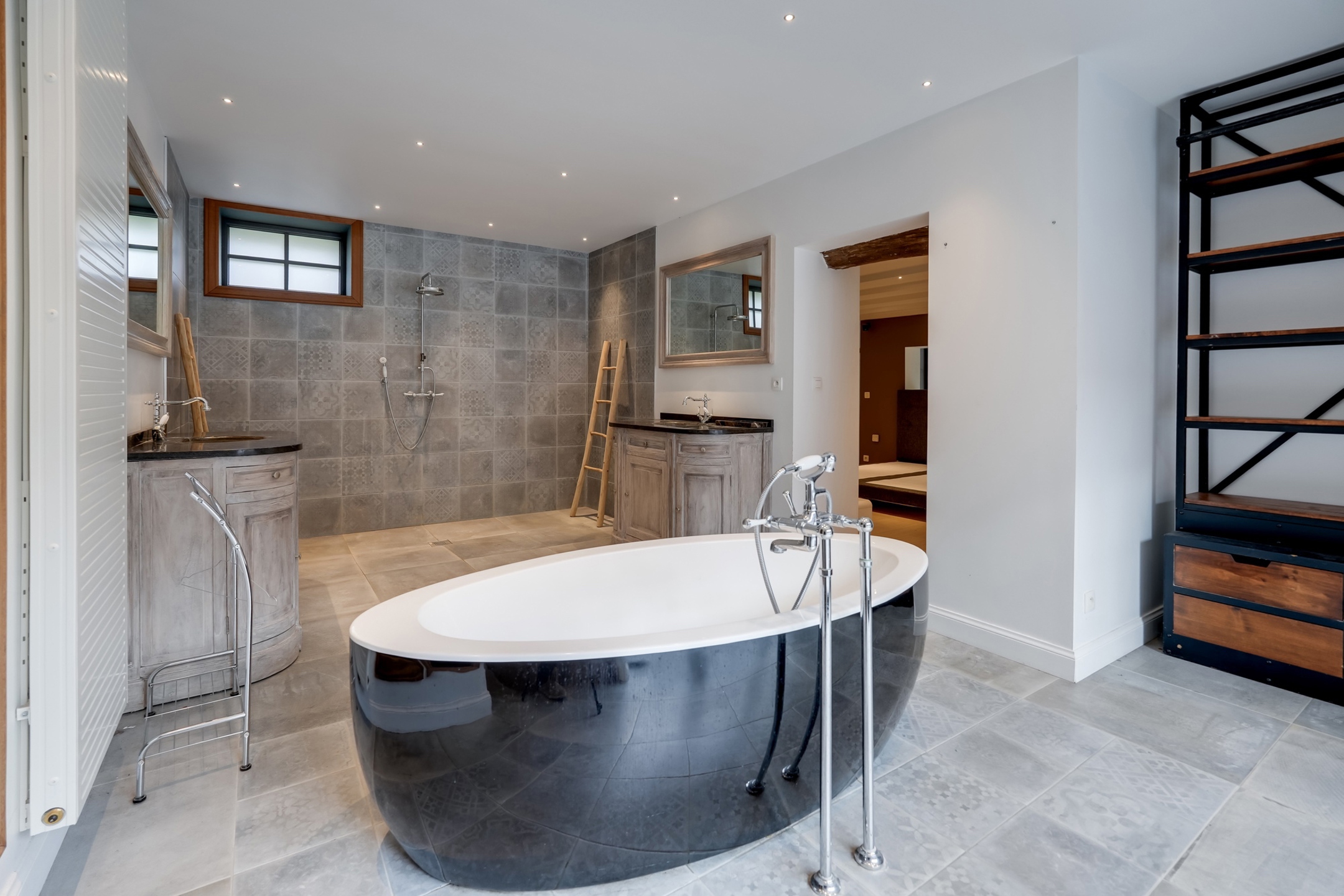 Les extérieurs sont tout aussi impressionnants, avec pas moins de trois terrasses : une cour intérieure accueillant la piscine, l’espace bien-être, le jacuzzi, le sauna et le barbecue ; une terrasse en façade avec un salon d’été et un second barbecue ; et enfin, une troisième terrasse à l’arrière, bordée d’un agréable jardin.