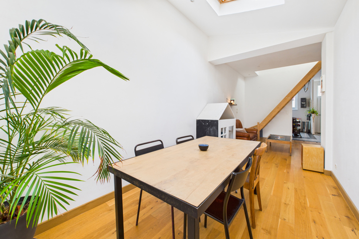Au REZ : Un hall d’entrée desservant une cuisine équipée ouverte (plaque de cuisson, hotte, four, évier, lave-vaisselle et rangements intégrés), un séjour (salon et salle à manger) avec escalier apparent. La pièce de vie est baignée de lumière par toutes ses ouvertures.