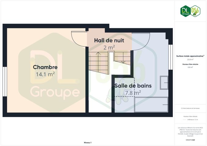 Au 1er étage : Hall de nuit desservant une grande chambre à coucher de 14m2, une salle de bains composée d’une baignoire/douche, d’un meuble lavabo et d’un coin laverie.