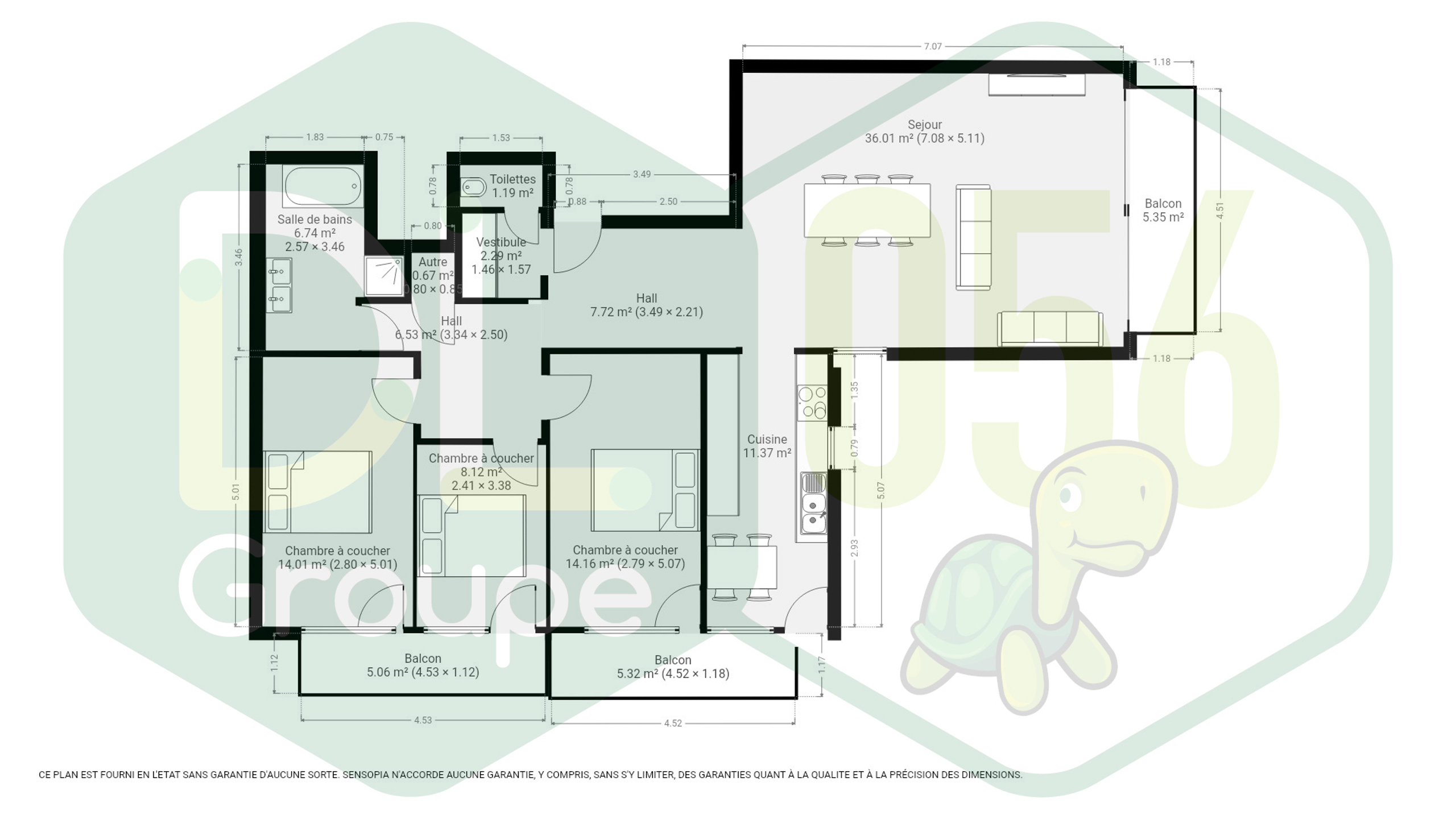Le hall de nuit dessert 3 belles chambres à coucher de 14m², 14m² et 8m² donnant un accès à un troisième balcon,