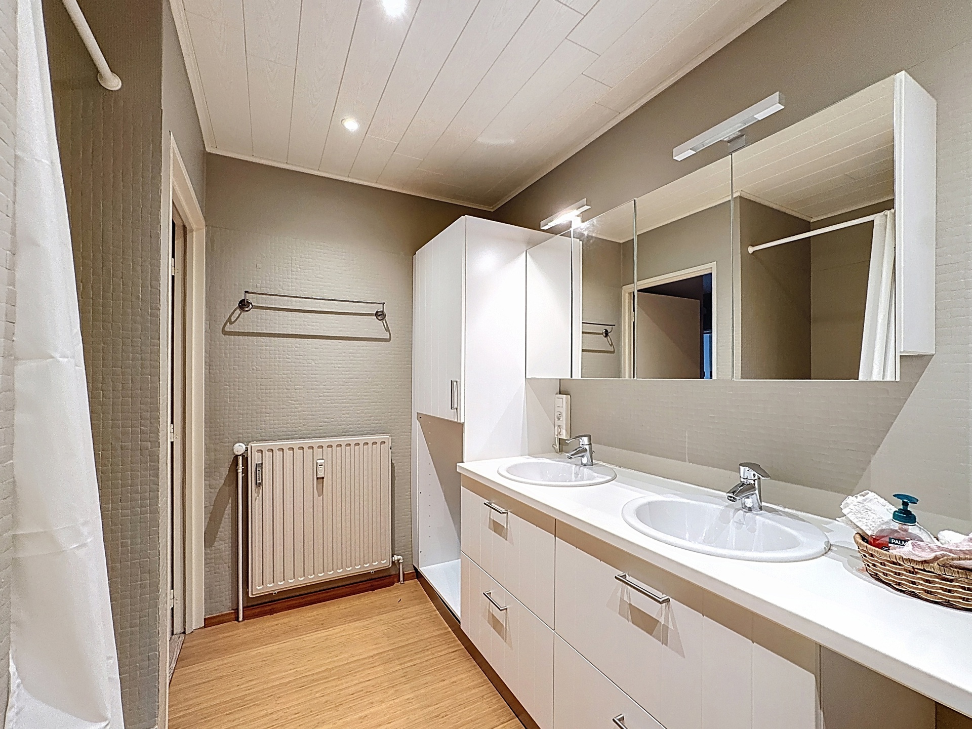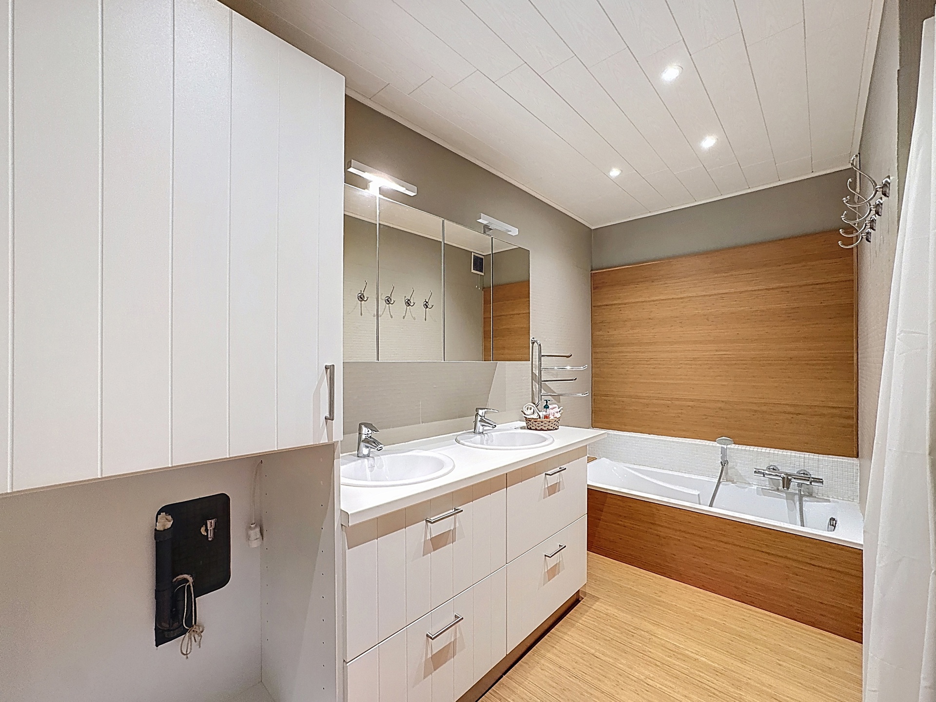 Salle de bains composée d’une baignoire, d’une douche, d’un meuble lavabo double vasque et d’un coin laverie, un WC suspendu séparé avec lave-mains, un espace de stockage.