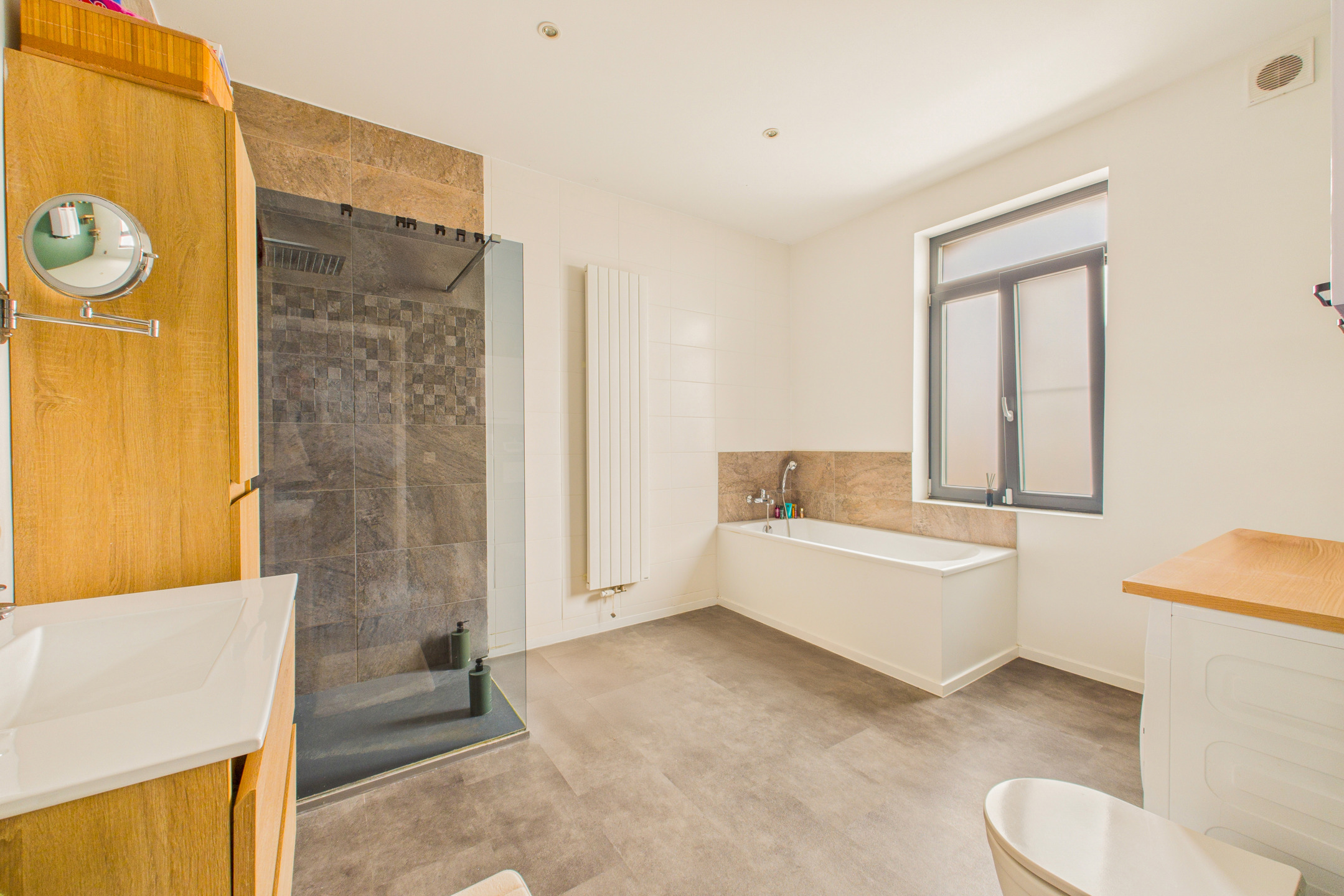 Au premier étage, vous trouverez une chambre spacieuse et une salle de bains élégante, équipée d’une douche à l’italienne, d’une baignoire, d’un meuble lavabo moderne, d’un WC suspendu et d’un espace buanderie pratique.