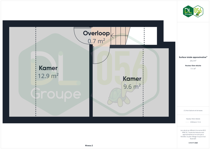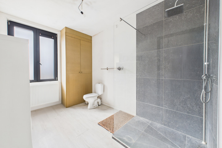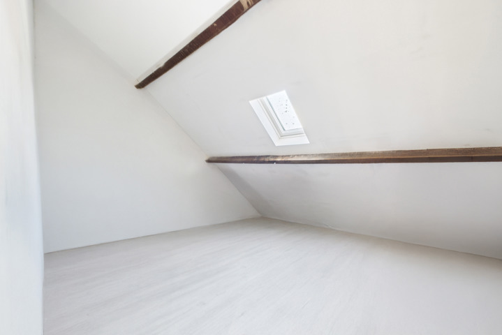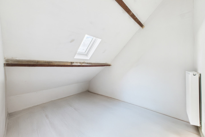 Au premier étage, vous trouverez une grande chambre et une salle de bains moderne avec douche à l’italienne, meuble vasque et toilettes. Le deuxième étage comprend deux chambres mansardées, chacune équipée de fenêtres de toit Velux à double vitrage.