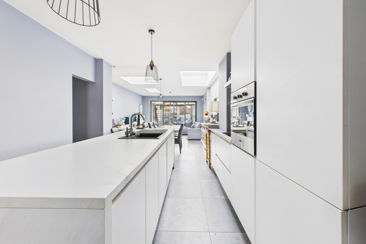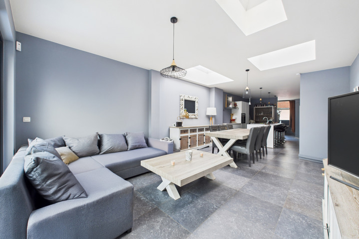 Cette charmante maison offre confort et fonctionnalité sur trois étages. Au rez-de-chaussée, un hall d’entrée spacieux vous accueille et donne accès à une buanderie pratique, des toilettes séparées et un séjour convivial. La cuisine ouverte entièrement équipée – avec plaque de cuisson, hotte, four, réfrigérateur, évier et rangements – dispose d’un îlot central et communique avec le salon lumineux. Ce dernier est baigné de lumière naturelle grâce à trois verrières. La maison dispose également d’un espace de rangement avec accès à la cave.