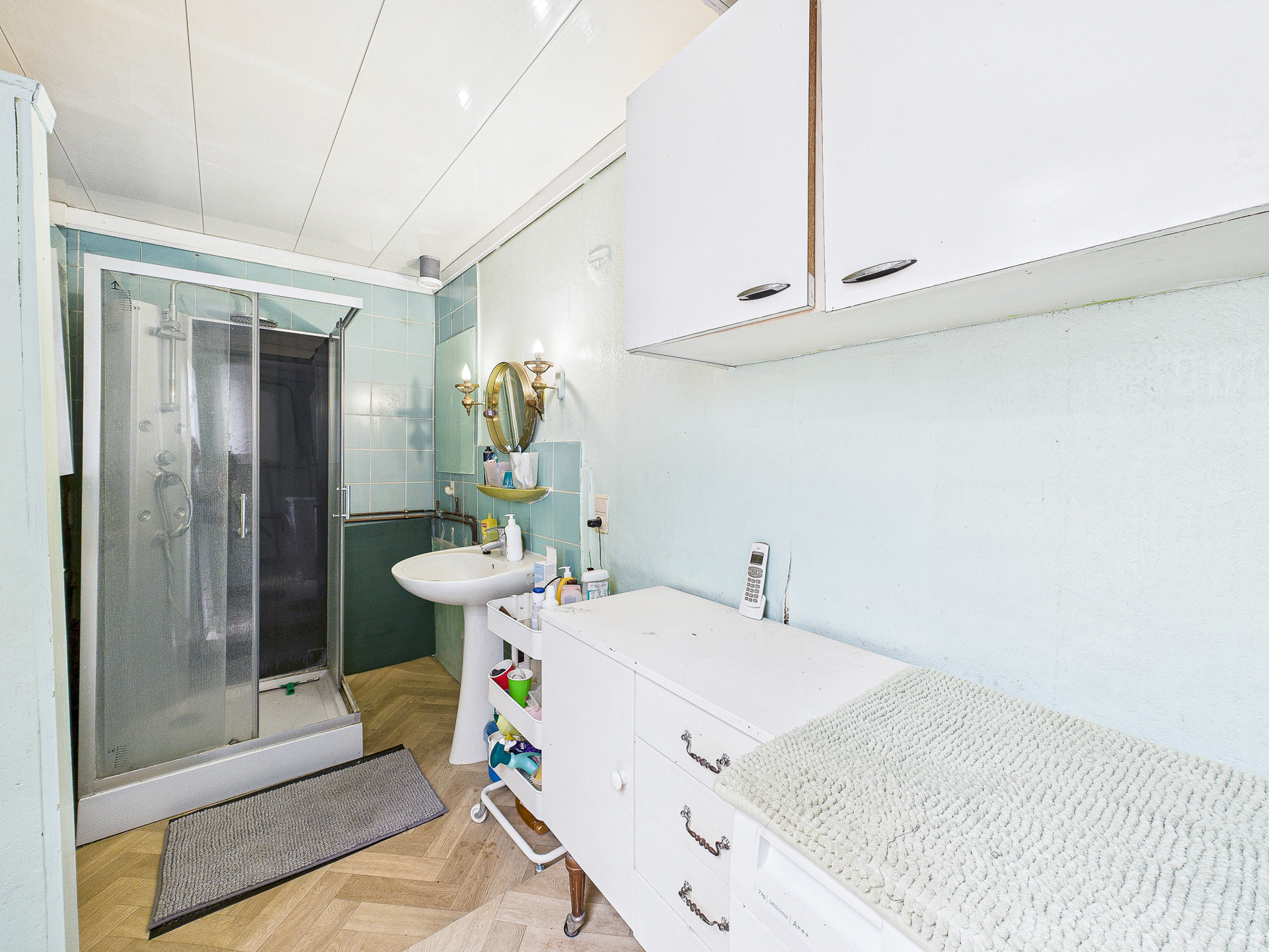 • Salle de bain avec douche, lavabo et coin machine à laver