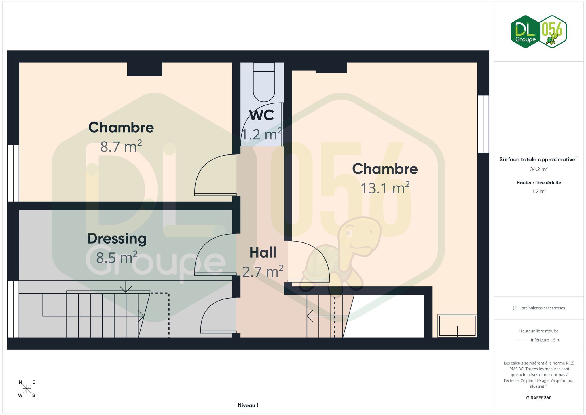Au 1er étage : Hall de nuit desservant 2 chambres à coucher de 13m2 et 9m2 (dont une avec un point d’eau), un WC séparé, un espace dressing (offrant également l’accès au 2e étage).