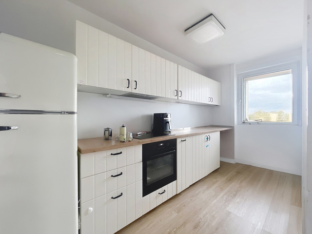 Cuisine équipée (plaque vitrocéramique, four, hotte, évier en inox, nombreux rangements intégrés),