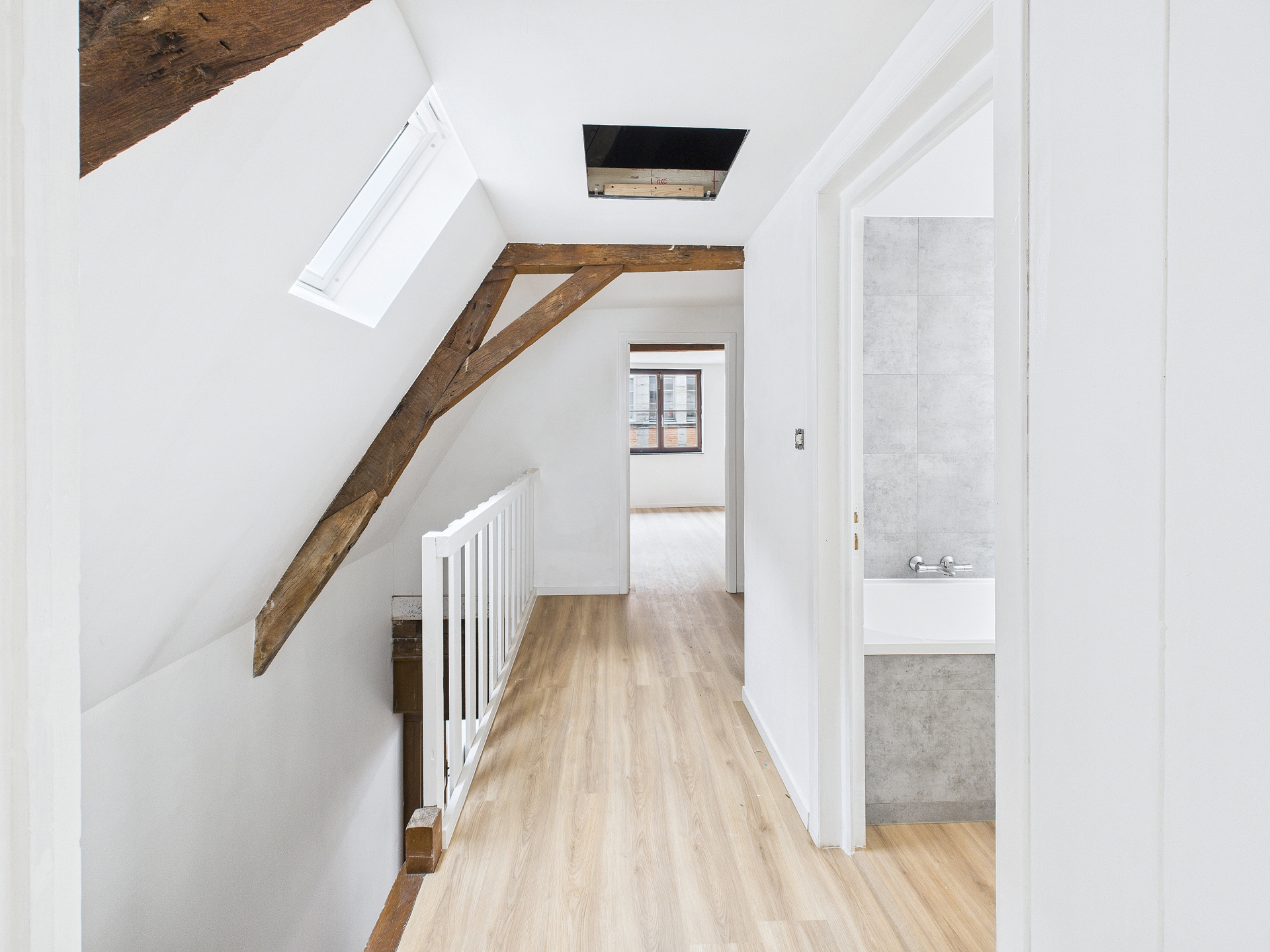 Au 2? étage : deux chambres spacieuses (dont une avec vue sur la cathédrale), salle de bain et espace buanderie.
