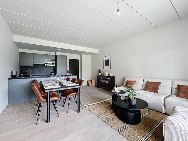 Un espace de vie convivial avec une cuisine entièrement équipée (four, taques, hotte, micro-ondes, évier, lave-vaisselle, frigo et congélateur). accèdant sur une tarrasse en roof top.