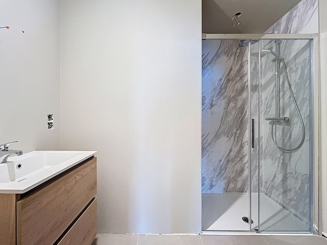 La salle de bain est équipée d’une douche et d’un lavabo.