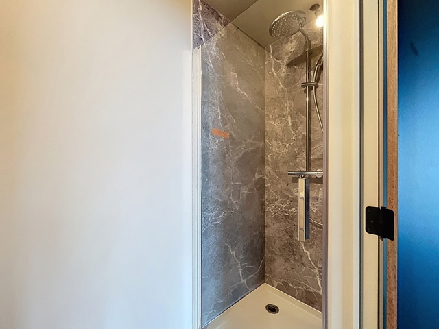 La salle de bain est équipée d’une douche et d’un lavabo.
