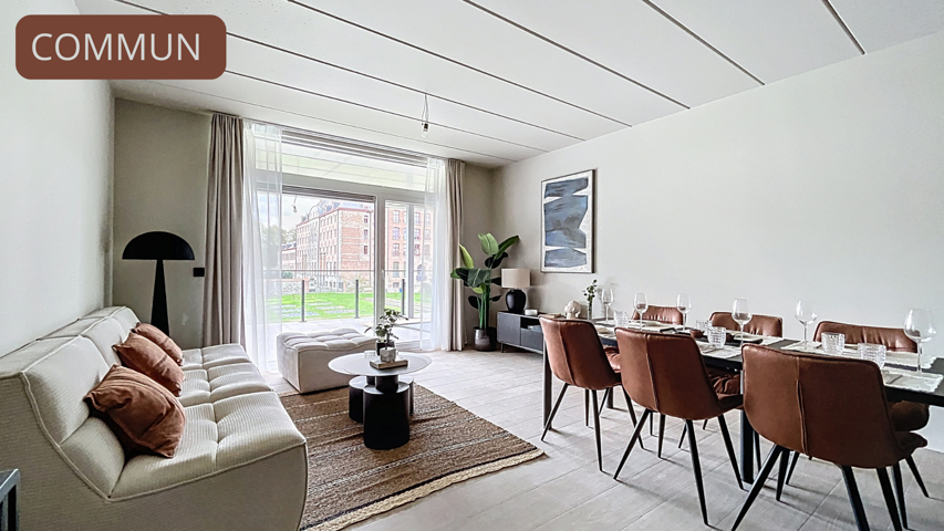 Un espace de vie convivial avec une cuisine entièrement équipée (four, taques, hotte, micro-ondes, évier, lave-vaisselle, frigo et congélateur). accèdant sur une tarrasse en roof top.