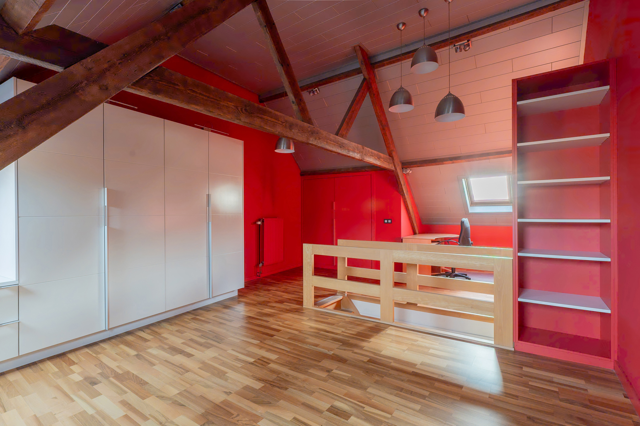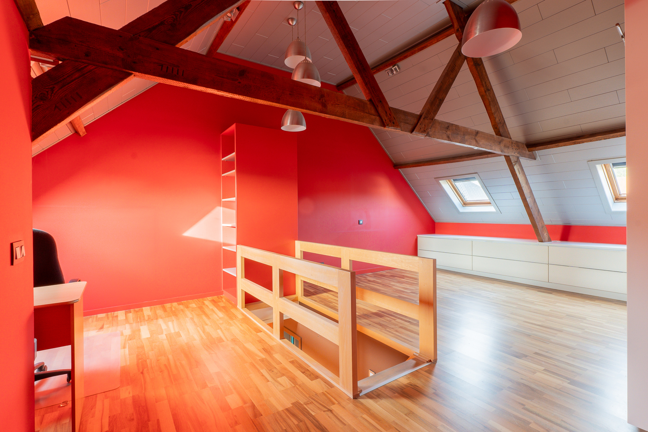 Au 2ème étage : Grenier aménagé en une spacieuse chambre à coucher de 35m² pouvant également faire office de bureau, un espace chaufferie. Avantage d’avoir un escalier fixe situé sur le hall de nuit. Possibilité de scinder la pièce afin d`obtenir 2 chambres ou bureau.
