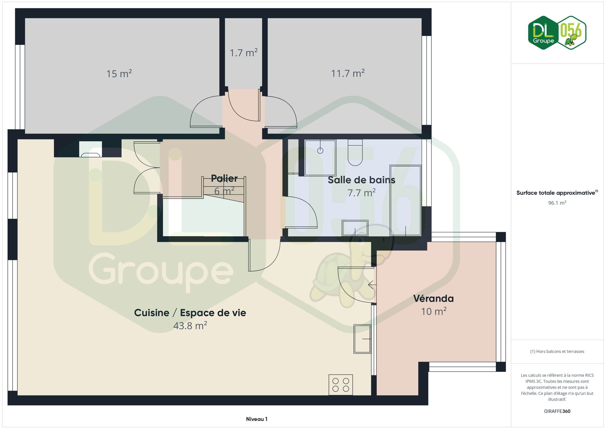 Au 1er étage : Un hall dessert un lumineux séjour (salon et salle à manger), une cuisine équipée ouverte sur le séjour (plaque de cuisson au gaz, hotte, double évier en inox, frigo, rangements intégrés), une véranda carrelée offrant également un accès directement à l’extérieur.
