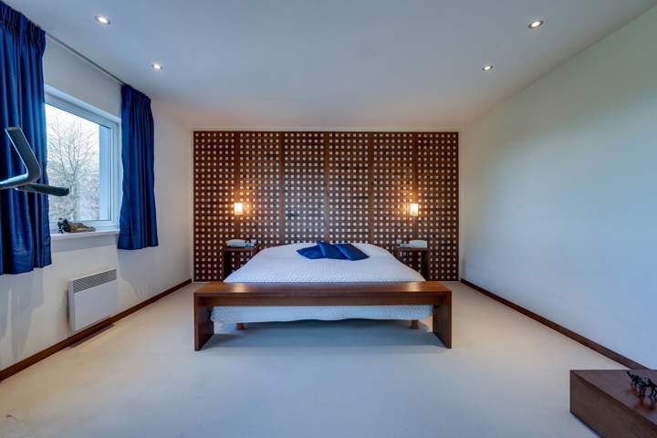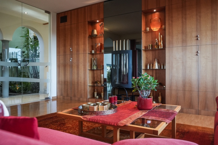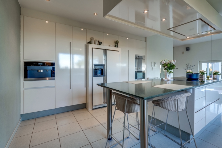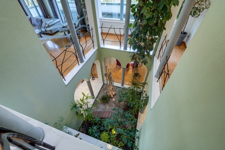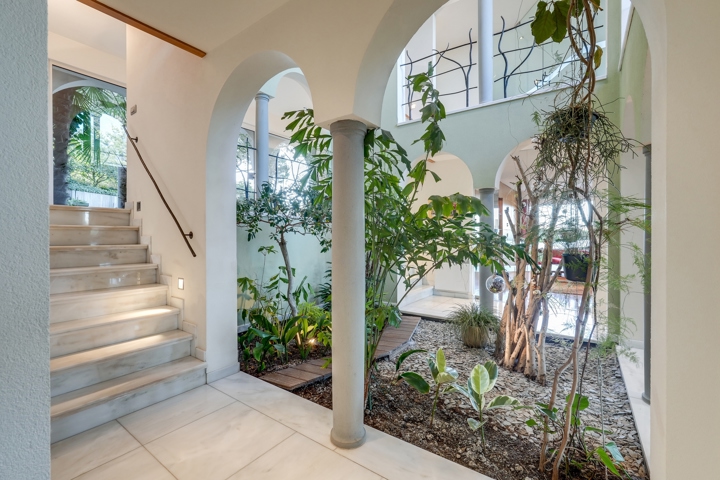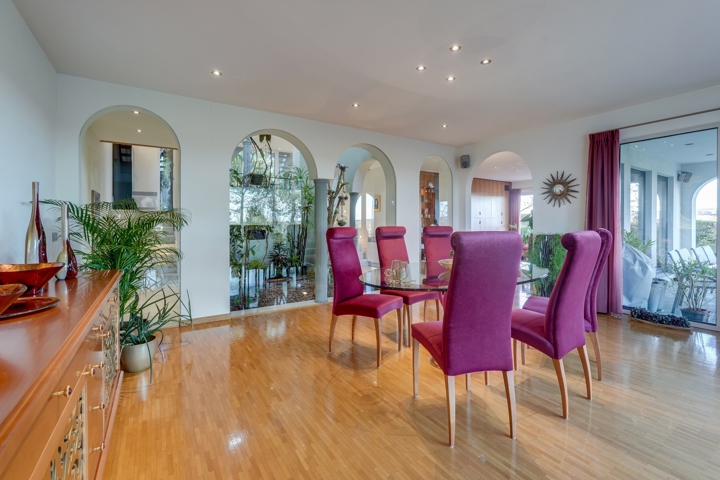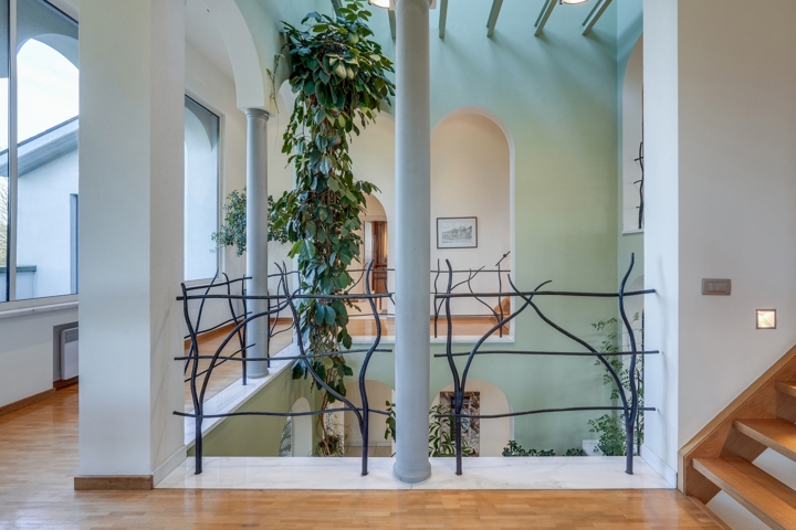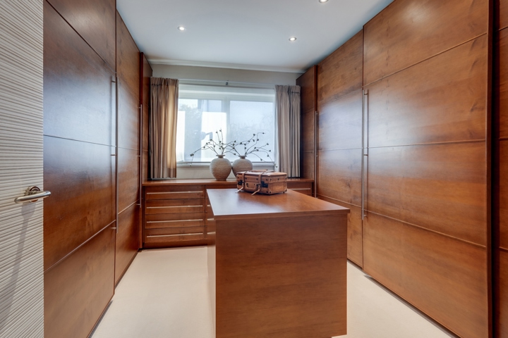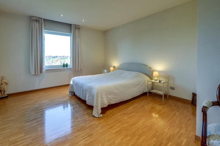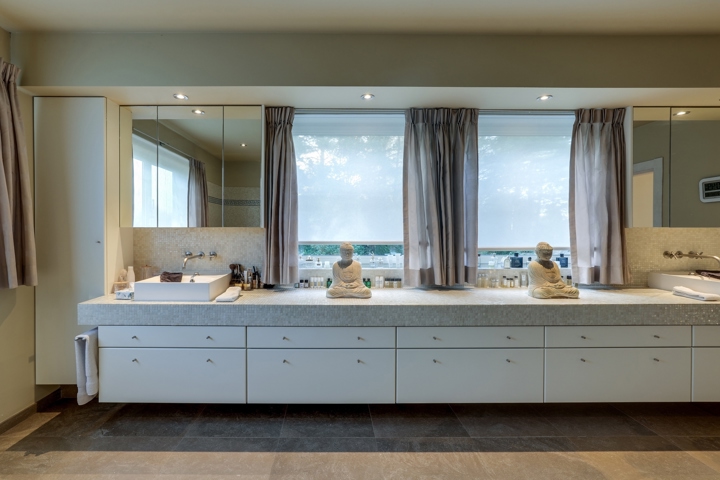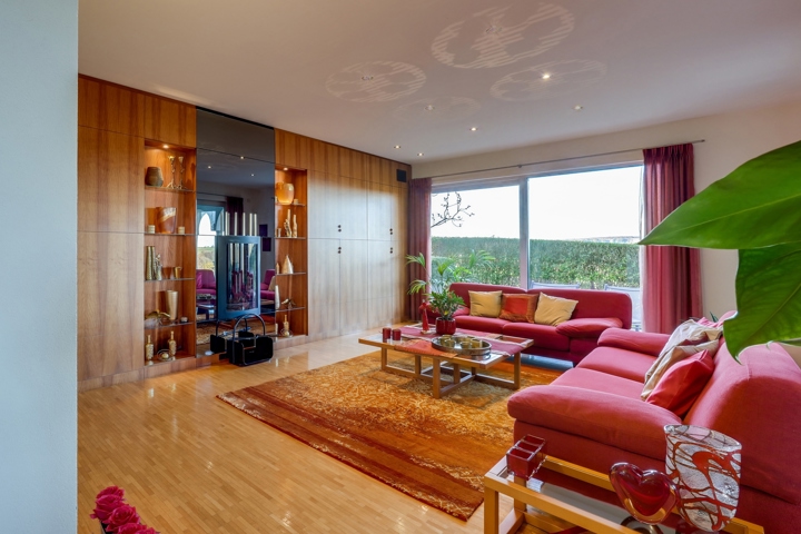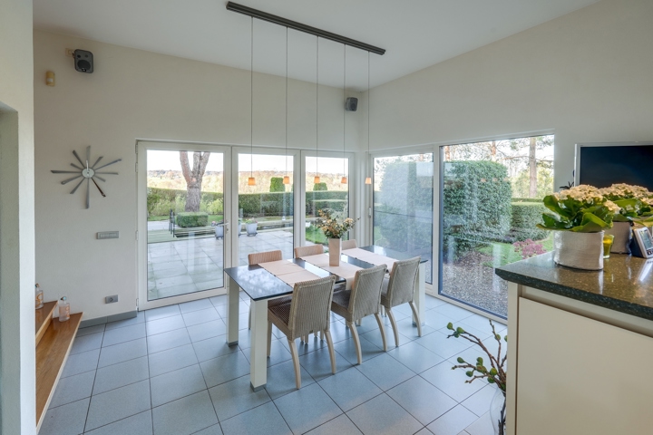 Organisée autour d’un atrium central baigné de lumière, cette villa de +/- 350 mètres carrés se compose de demi-niveaux qui apportent volume et fluidité aux espaces. Le hall d’entrée en marbre mène vers un bureau ainsi que vers de superbes pièces de réception : un salon raffiné avec feu ouvert et bibliothèque sur mesure, une salle à manger élégante, et une cuisine haut de gamme avec îlot central et coin à déjeuner, prolongée par l’une des terrasses offrant une vue apaisante sur le jardin.