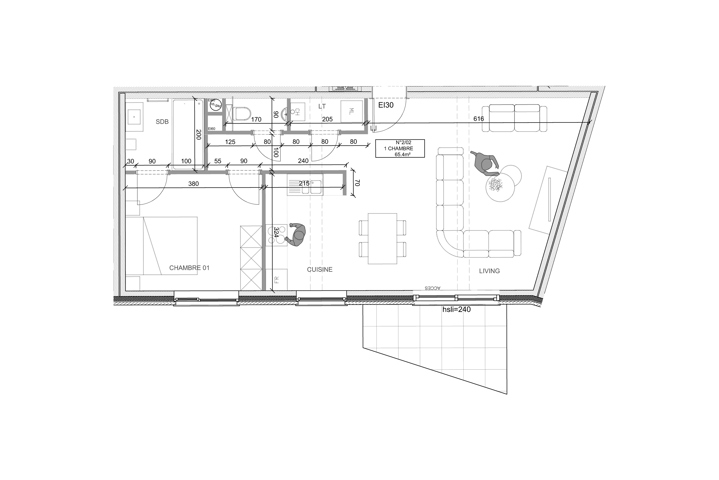 - Agencement : hall, séjour avec cuisine équipée ouverte donnant sur une terrasse, buanderie, wc séparé avec lave-mains, salle de douche, meuble vasque, miroir, 1 chambre