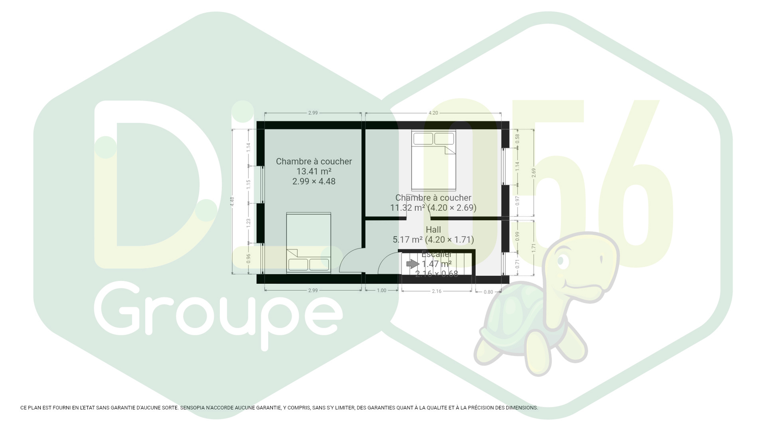 Au 1er étage : Hall de nuit desservant 2 chambres à coucher de 13m² et 11m².