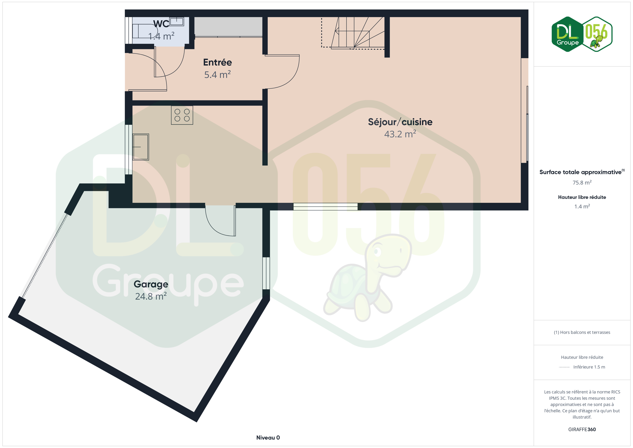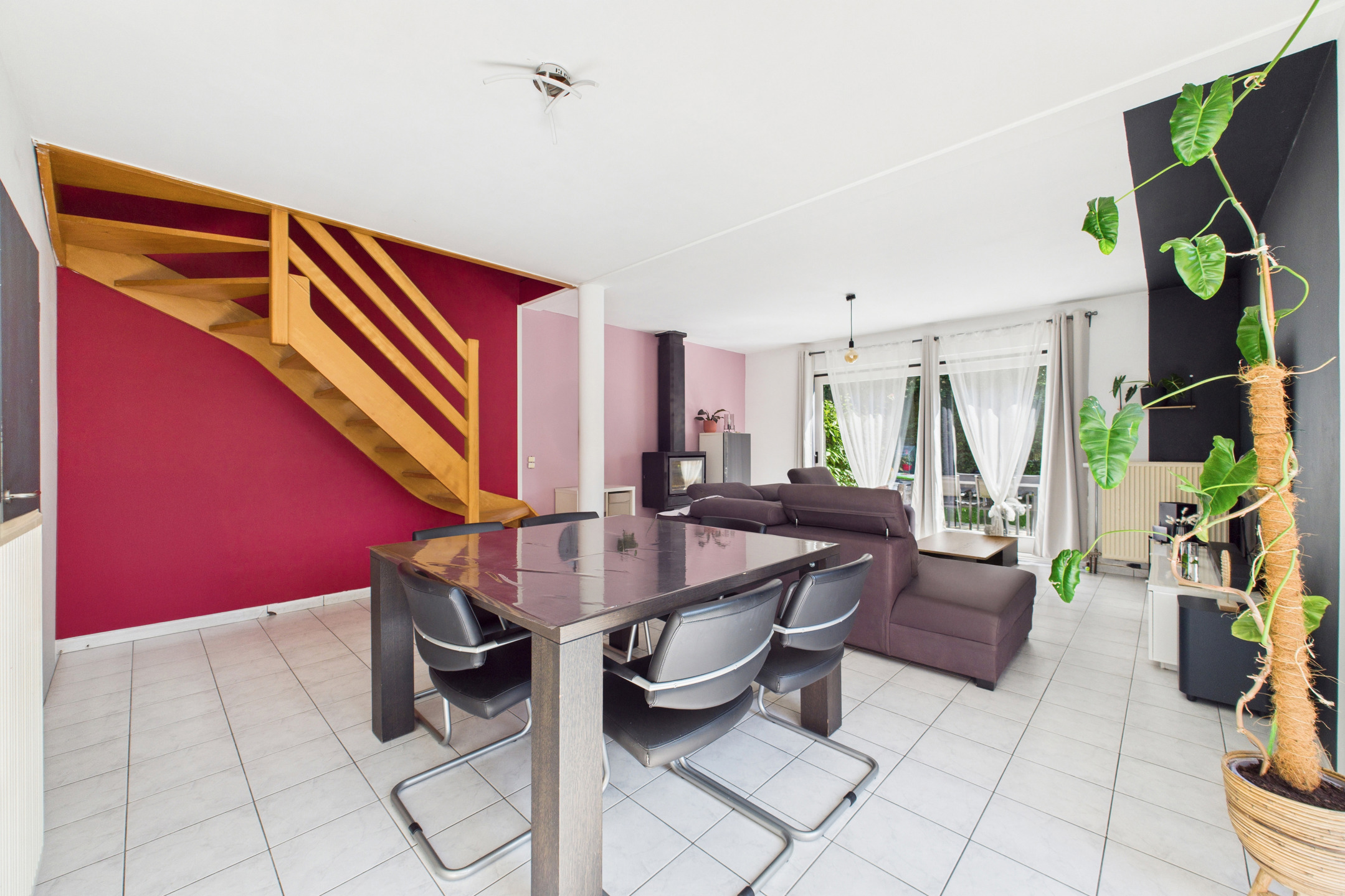 Au REZ: Hall d’entrée avec WC séparé mène vers un vaste salon lumineux habillé de carrelage, avec un escalier apparent. La cuisine équipée communique directement avec le garage.