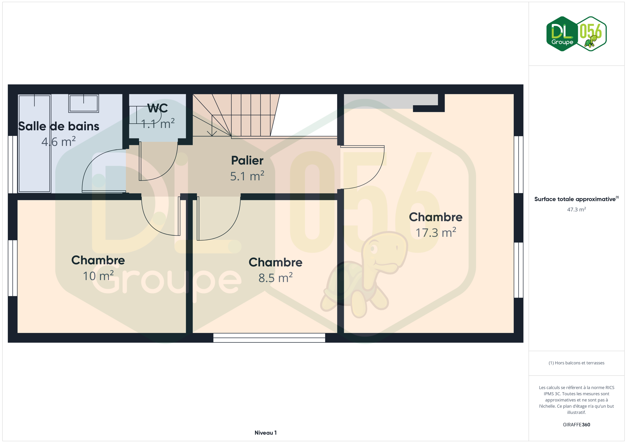 Au 1er étage: Hall de nuit distribue 3 chambres, une salle de bain carrelée avec baignoire-douche et meuble lavabo, un WC séparé ainsi qu’un grenier isolé accessible via escalier escamotable. Les chambres et le hall sont en parquet.