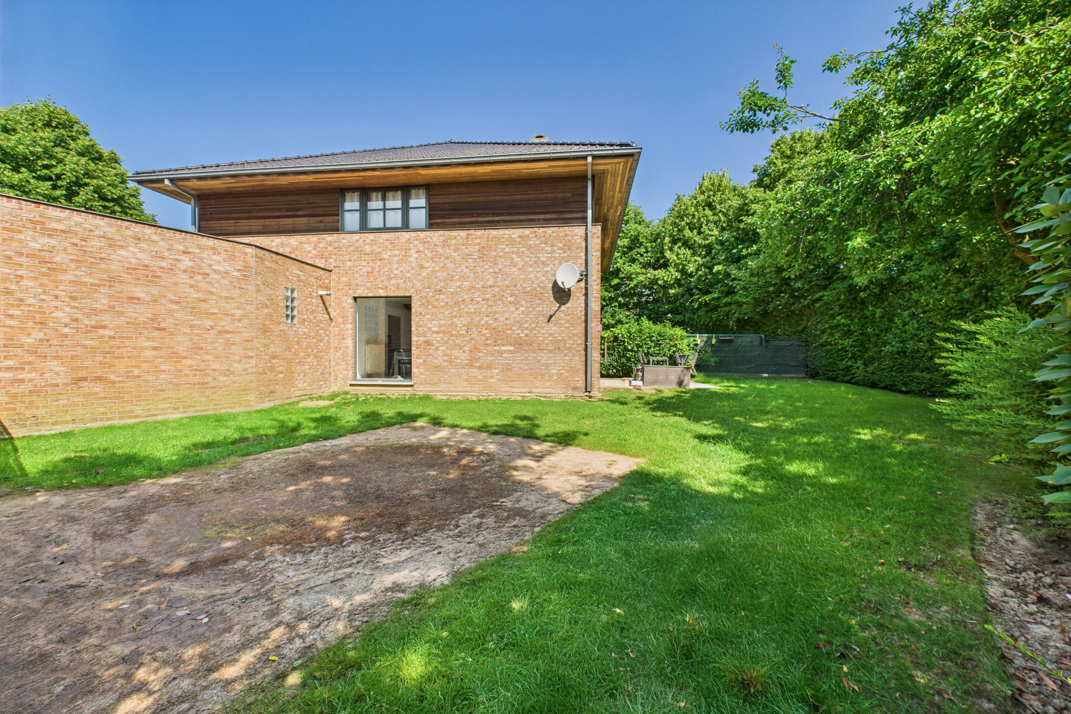 Extérieur: Une terrasse carrelée avec un grand jardin clôturé, avec peu de vis-à-vis, une place de parking privative face à la maison et garage privé.