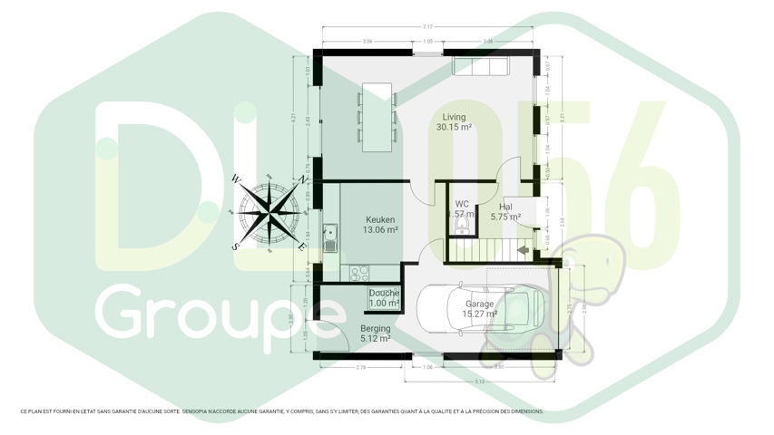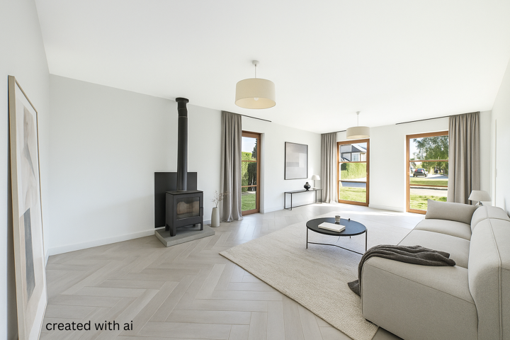 Au REZ : Hall d’entrée avec escalier apparent, un WC avec lave-mains, une beau séjour baigné de lumière de 30m2, une cuisine équipée attenante (plaque de cuisson, hotte, four, évier, nombreux rangements intégrés), un garage pour 1 voiture ainsi qu’une buanderie/chaufferie avec espace douche.