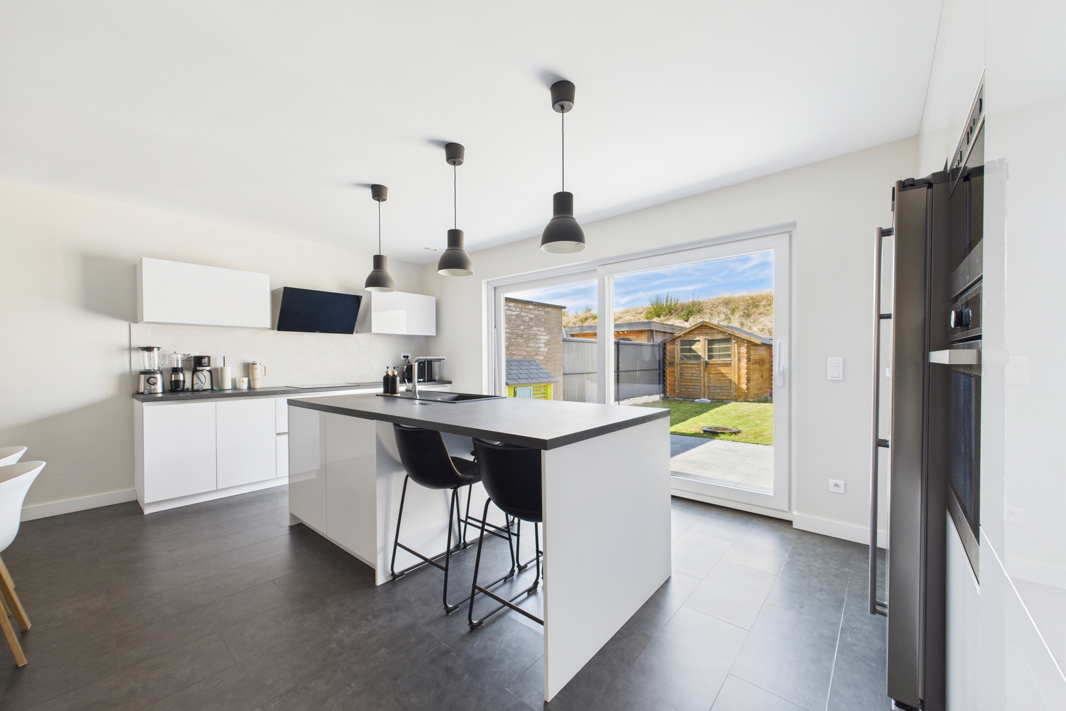 Au REZ : Un hall d’entrée avec coin vestiaire, un WC suspendu avec lave-mains, une magnifique pièce de vie baignée de lumière composé d’un séjour (salon et salle à manger), une belle cuisine équipée (plaque de cuisson, hotte, four, micro-ondes, lave-vaisselle, emplacement frigo américain, évier, ilot central avec coin repas et nombreux rangements), une buanderie/chaufferie [..]