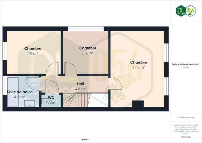 Au 1er étage: Hall de nuit distribue 3 chambres, une salle de bain carrelée avec baignoire-douche et meuble lavabo, un WC séparé ainsi qu’un grenier isolé accessible via escalier escamotable. Les chambres et le hall sont en parquet.
