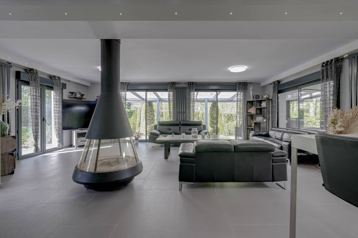 Caractéristiques : Climatisation réversible, chauffage central au mazout (nouvelle chaudière à condensation), VMC double flux, châssis en aluminium double vitrage, adoucisseur, persiennes motorisées, alarme, caméras, vidéophone.
