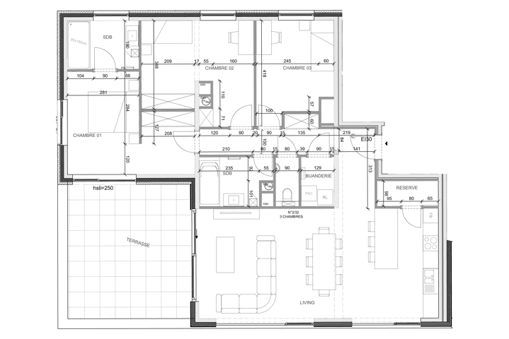 - Agencement : hall, séjour avec cuisine équipée ouverte donnant sur une terrasse, buanderie, wc séparé avec lave-mains, salle de bain avec douche italienne, baignoire, meuble double vasque, miroir, sèche-serviette et une salle de douche, meuble vasque, miroir, sèche-serviette 3 chambres