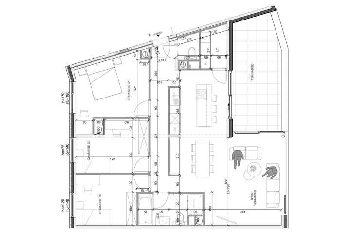 - Agencement : hall, séjour avec cuisine équipée ouverte donnant sur une terrasse, buanderie, wc séparé avec lave-mains, salle de bain avec douche et baignoire, meuble vasque, miroir, 3 chambres