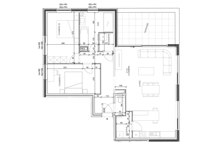 - Agencement : hall, séjour avec cuisine équipée ouverte donnant sur une terrasse, buanderie, wc séparé avec lave-mains, salle de bain avec douche italienne et baignoire, meuble vasque, miroir, 2 chambres