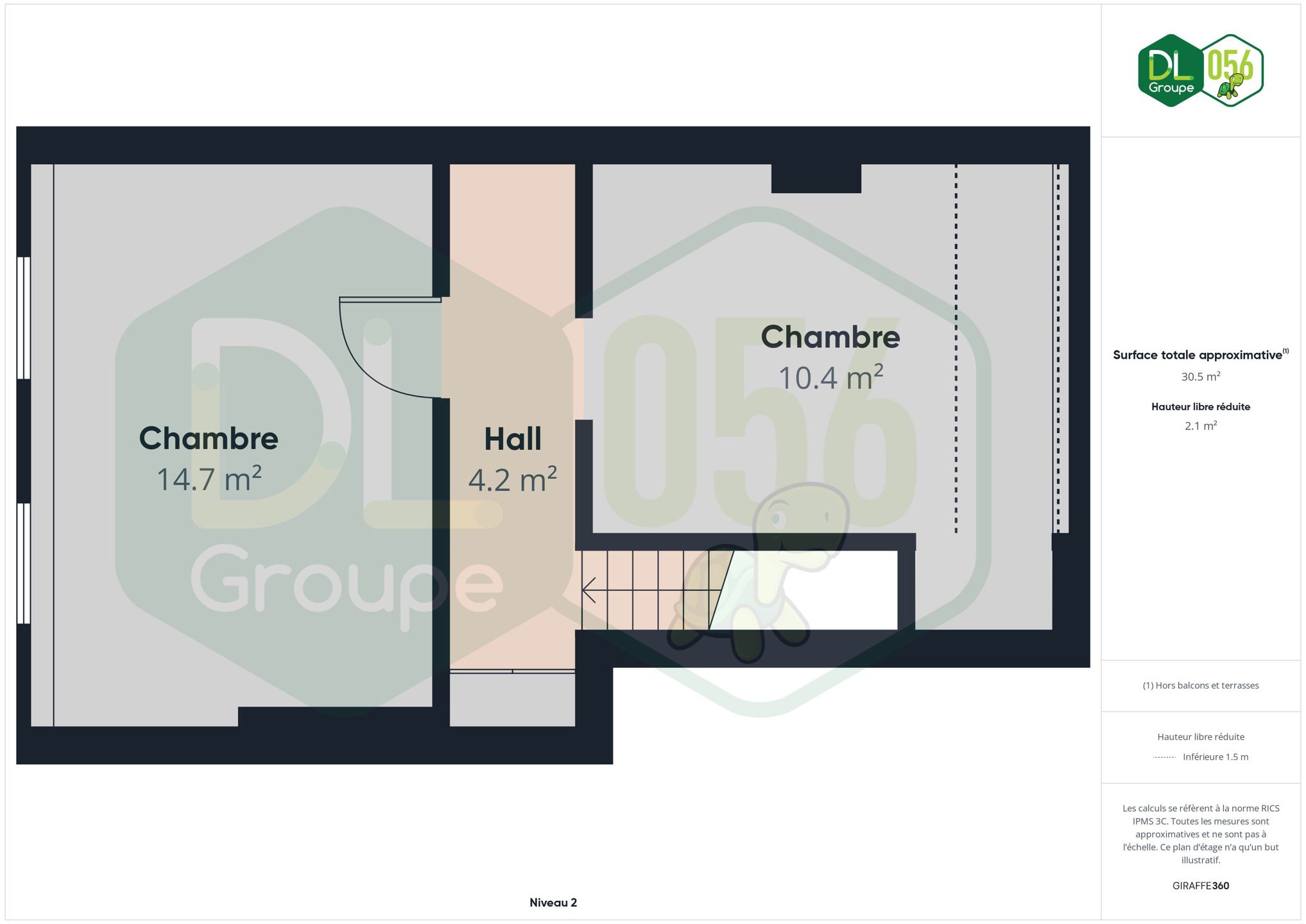 Au 2ème étage : Hall de nuit desservant 2 chambres à coucher de 15m² et 11m² avec l’avantage d’avoir un escalier fixe situé sur le hall de nuit. Un espace grenier dans les combles.